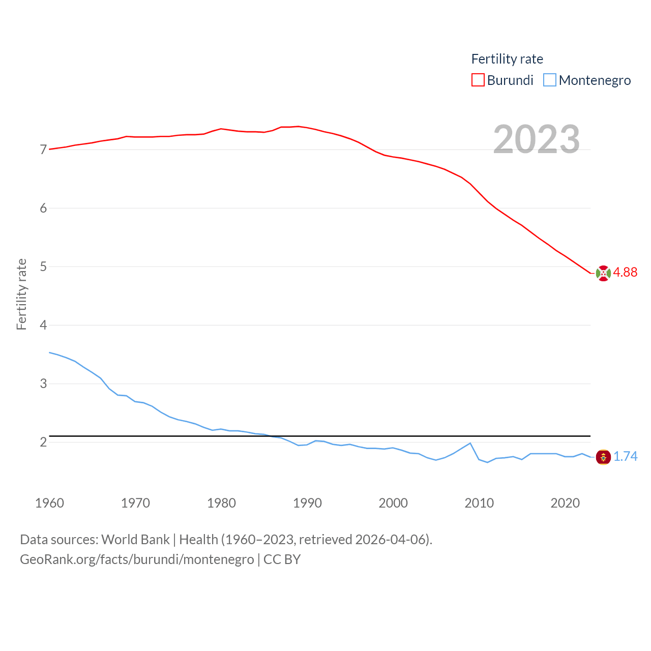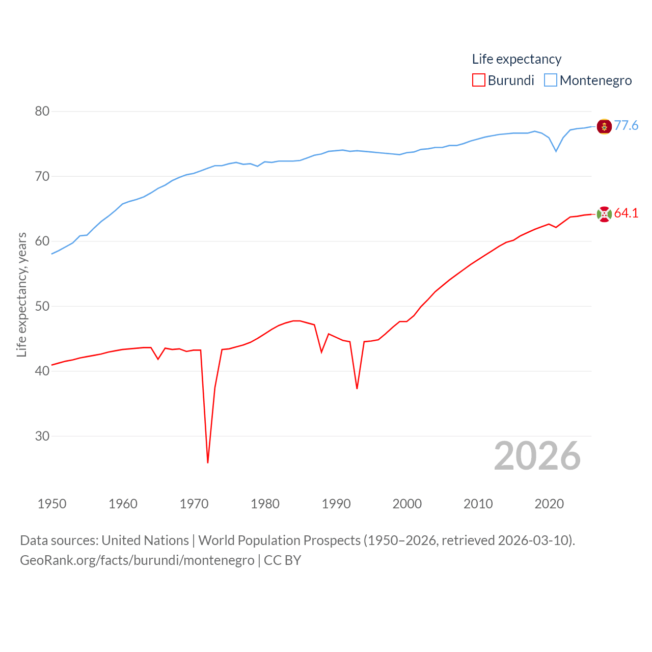 Burundi has a population of 14M (ranked 78/197), compared with 624K in Montenegro (ranked 166/197). Burundi's land area is 9,915 sq mi versus 5,193 sq mi for Montenegro (ranked 144th vs. 156th).