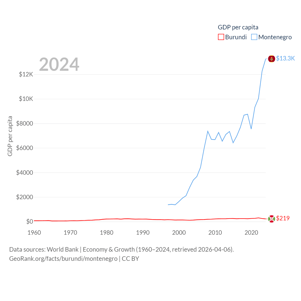 By GDP, Burundi ranks 169/197 ($3.08B) and Montenegro ranks 155/197 ($8.27B). By GDP per capita, Burundi ranks 197/197 ($219.4), while Montenegro ranks 77/197 ($13,263).