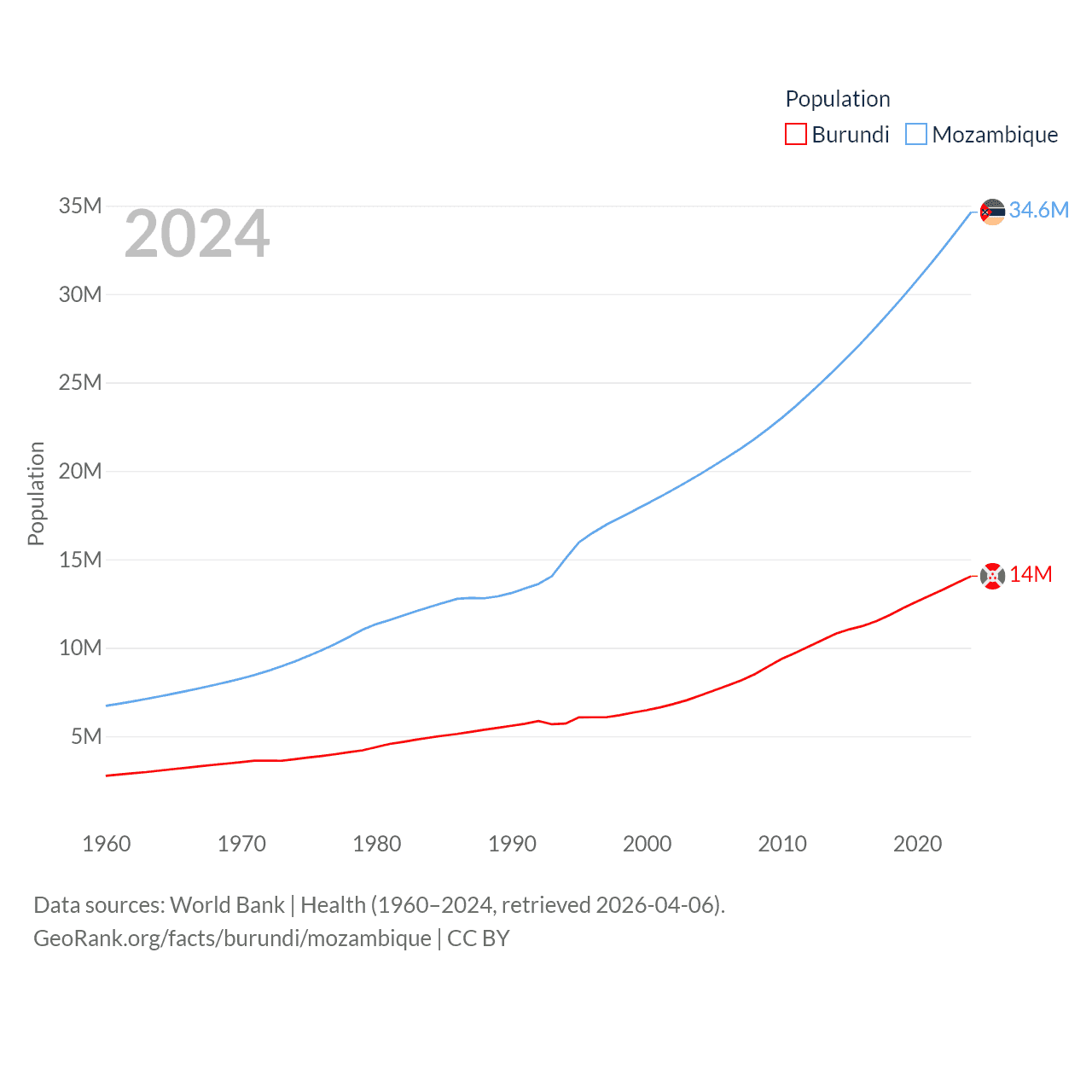 Burundi has a population of 14M (ranked 78/197), compared with 34.6M in Mozambique (ranked 46/197). Burundi's land area is 9,915 sq mi versus 303,623 sq mi for Mozambique (ranked 144th vs. 34th).