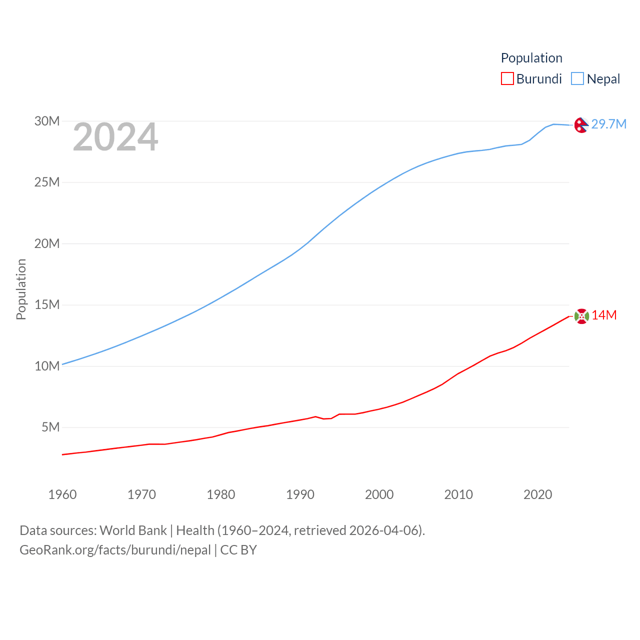 Burundi has a population of 14M (ranked 78/197), compared with 29.7M in Nepal (ranked 51/197). Burundi's land area is 9,915 sq mi versus 55,348 sq mi for Nepal (ranked 144th vs. 92nd).