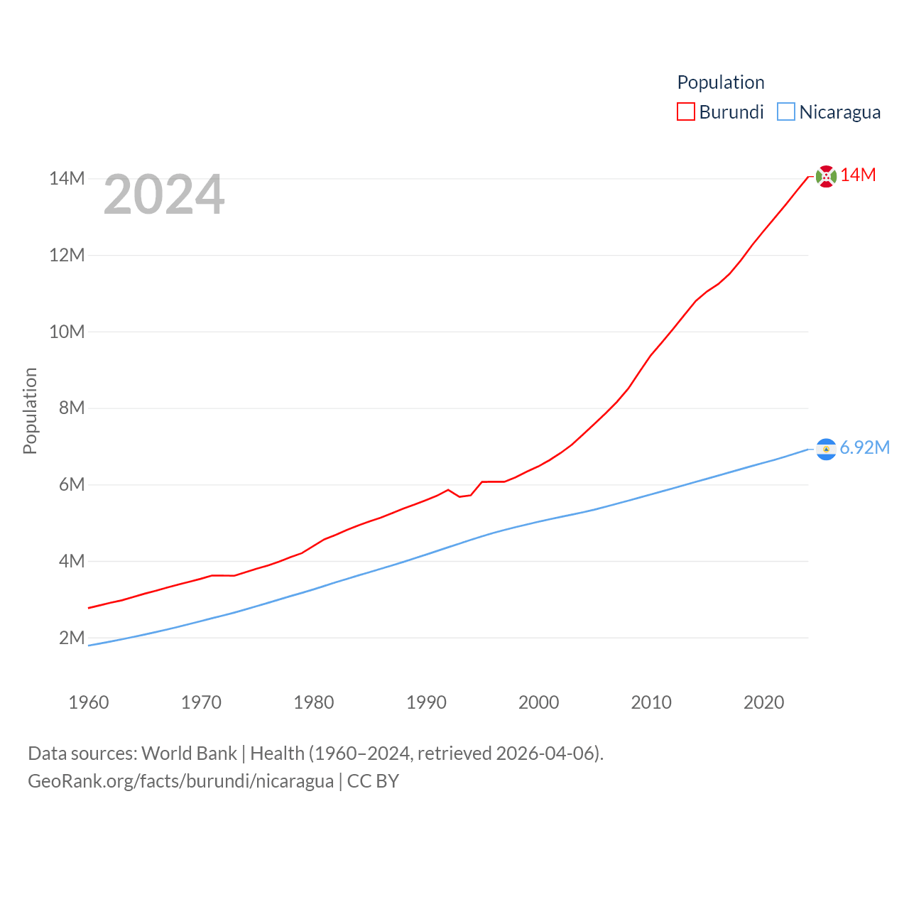 Burundi has a population of 14M (ranked 78/197), compared with 6.92M in Nicaragua (ranked 108/197). Burundi's land area is 9,915 sq mi versus 46,464 sq mi for Nicaragua (ranked 144th vs. 98th).
