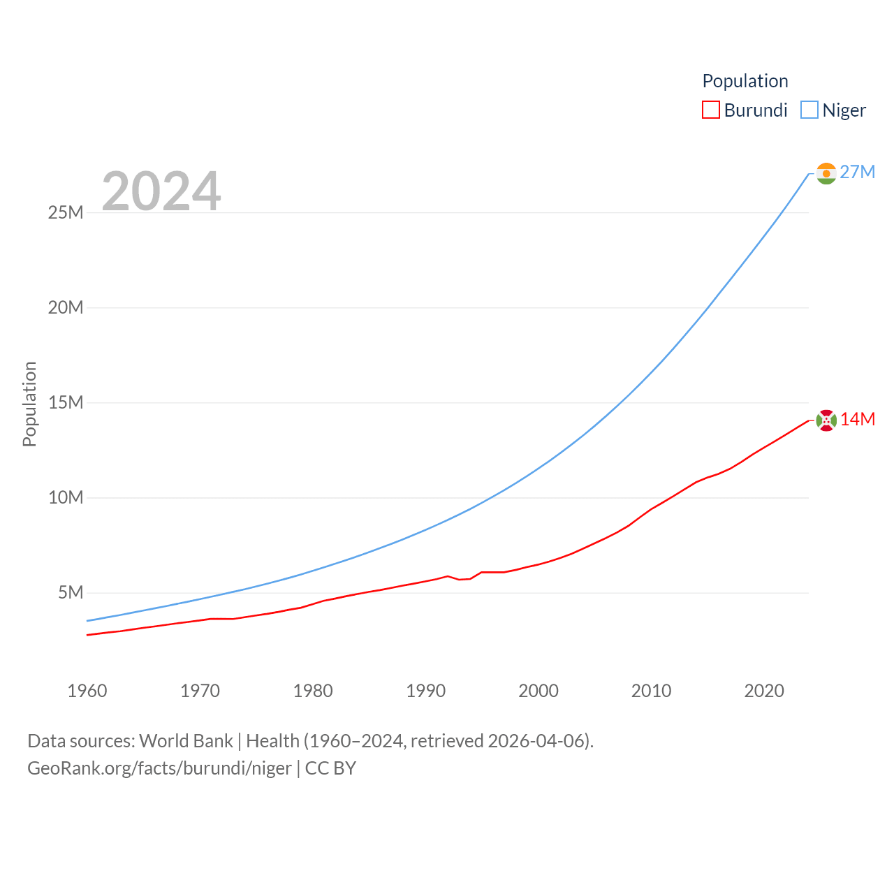 Burundi has a population of 14M (ranked 78/197), compared with 27M in Niger (ranked 55/197). Burundi's land area is 9,915 sq mi versus 489,076 sq mi for Niger (ranked 144th vs. 20th).
