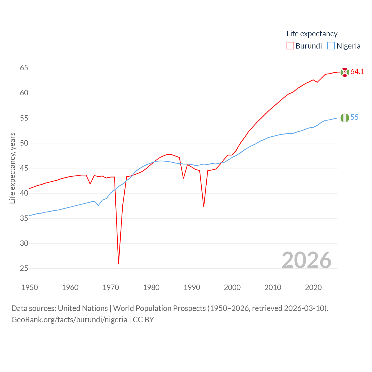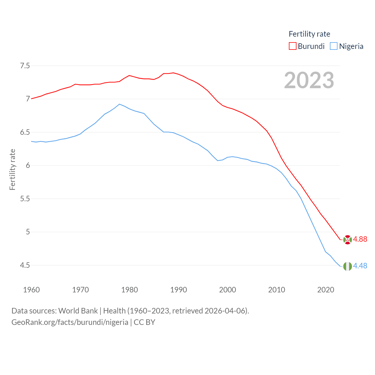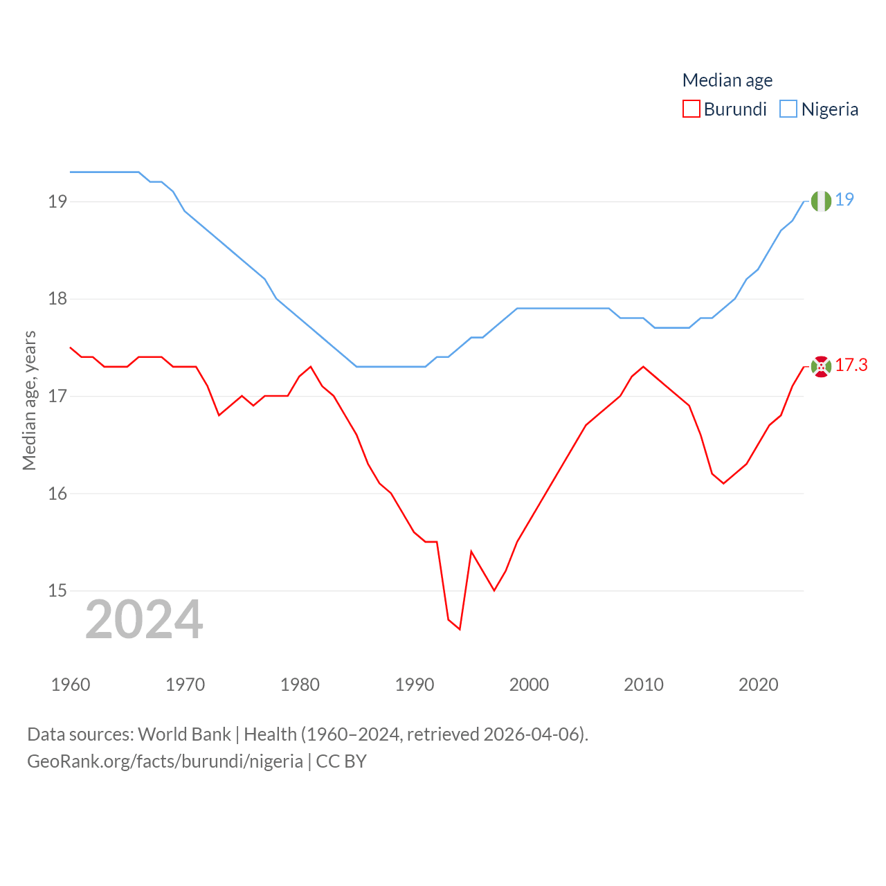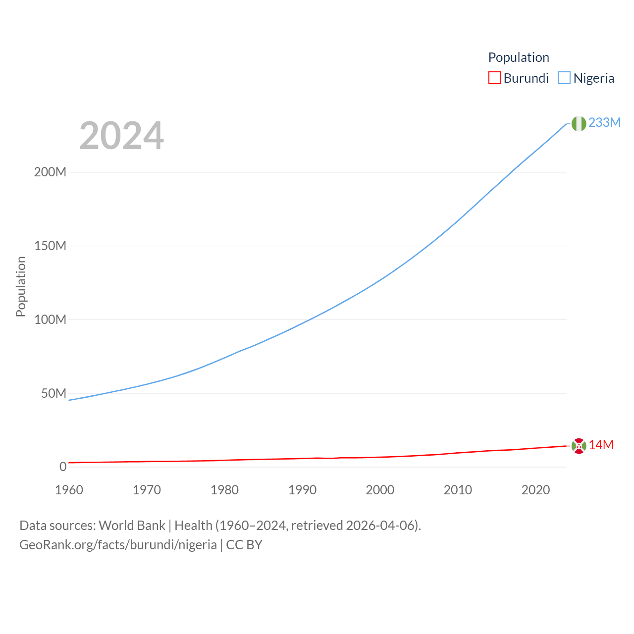 Burundi has a population of 14M (ranked 78/197), compared with 233M in Nigeria (ranked 6/197). Burundi's land area is 9,915 sq mi versus 351,650 sq mi for Nigeria (ranked 144th vs. 30th).