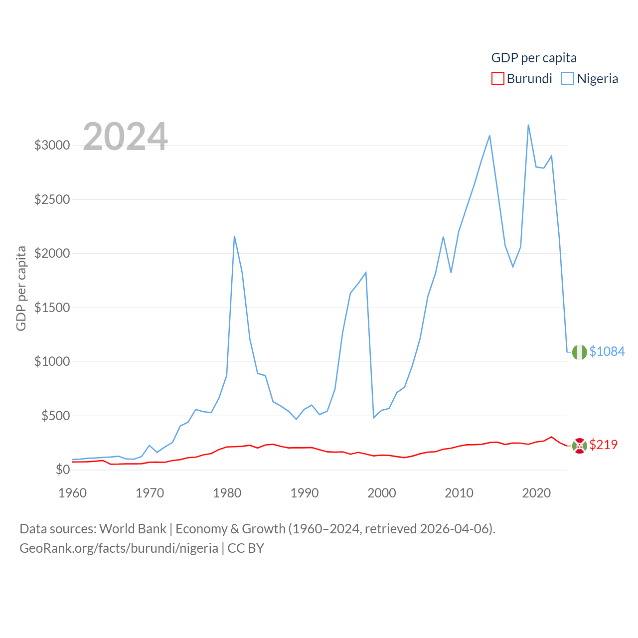 By GDP, Burundi ranks 169/197 ($3.08B) and Nigeria ranks 54/197 ($252B). By GDP per capita, Burundi ranks 197/197 ($219.4), while Nigeria ranks 174/197 ($1,084).