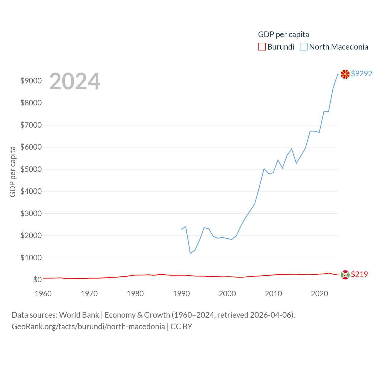 By GDP, Burundi ranks 169/197 ($3.08B) and North Macedonia ranks 138/197 ($17B). By GDP per capita, Burundi ranks 197/197 ($219.4), while North Macedonia ranks 88/197 ($9,292).