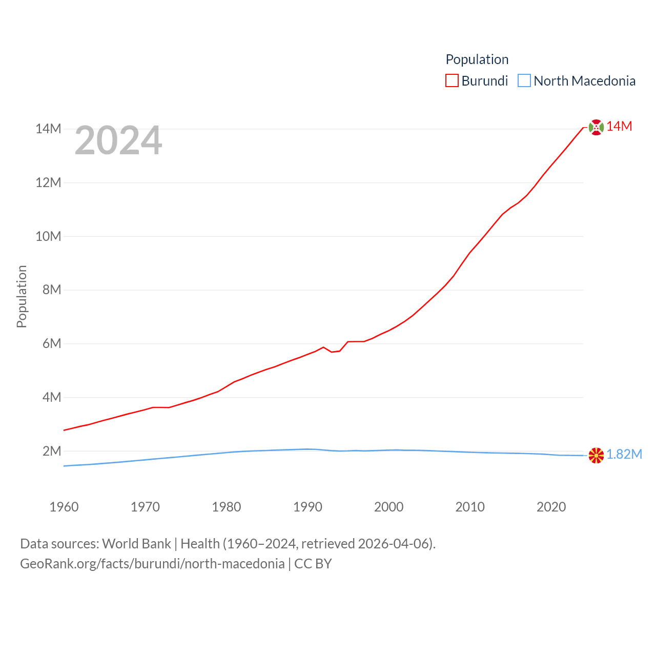 Burundi has a population of 14M (ranked 78/197), compared with 1.82M in North Macedonia (ranked 150/197). Burundi's land area is 9,915 sq mi versus 9,737 sq mi for North Macedonia (ranked 144th vs. 145th).