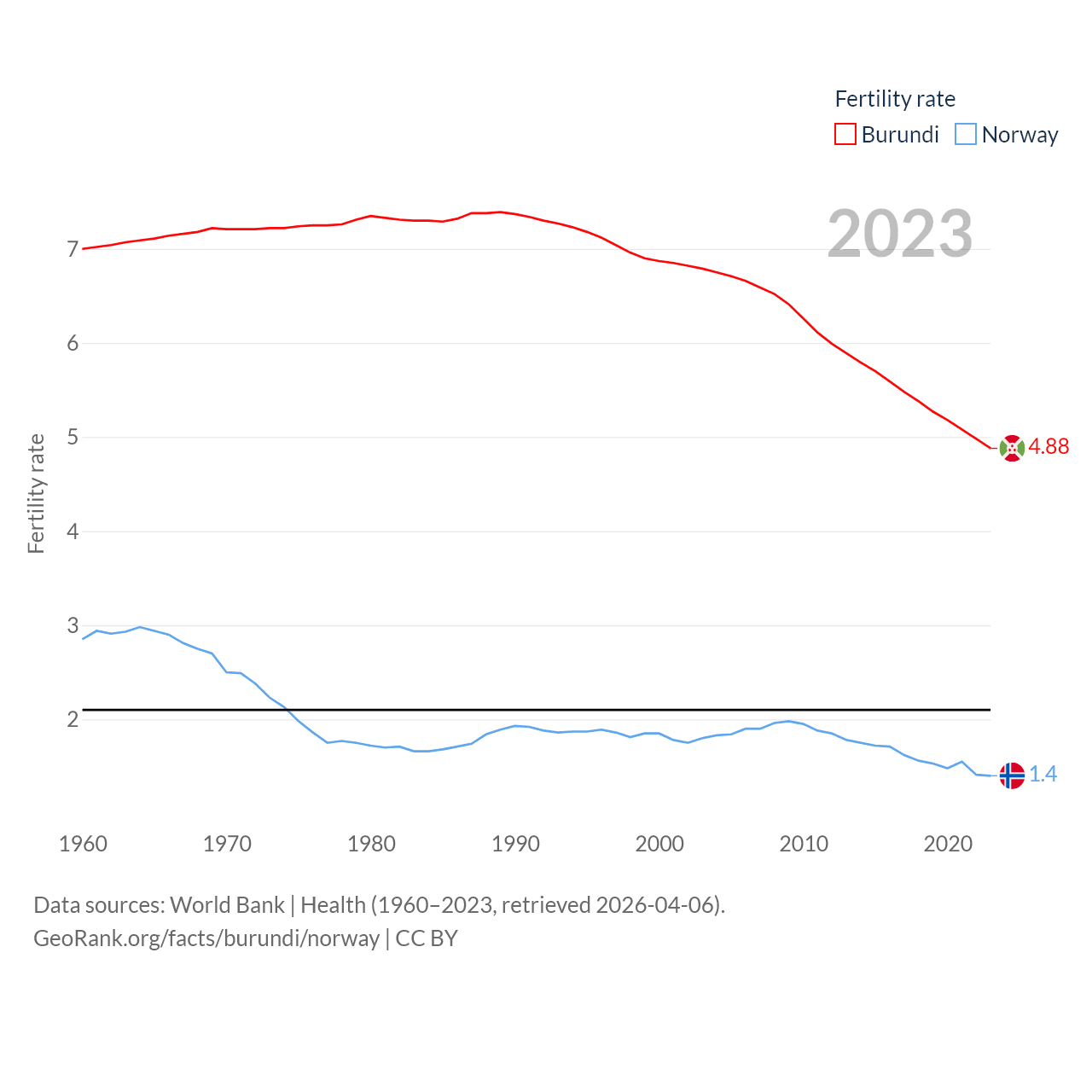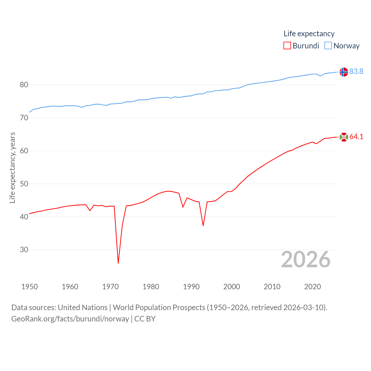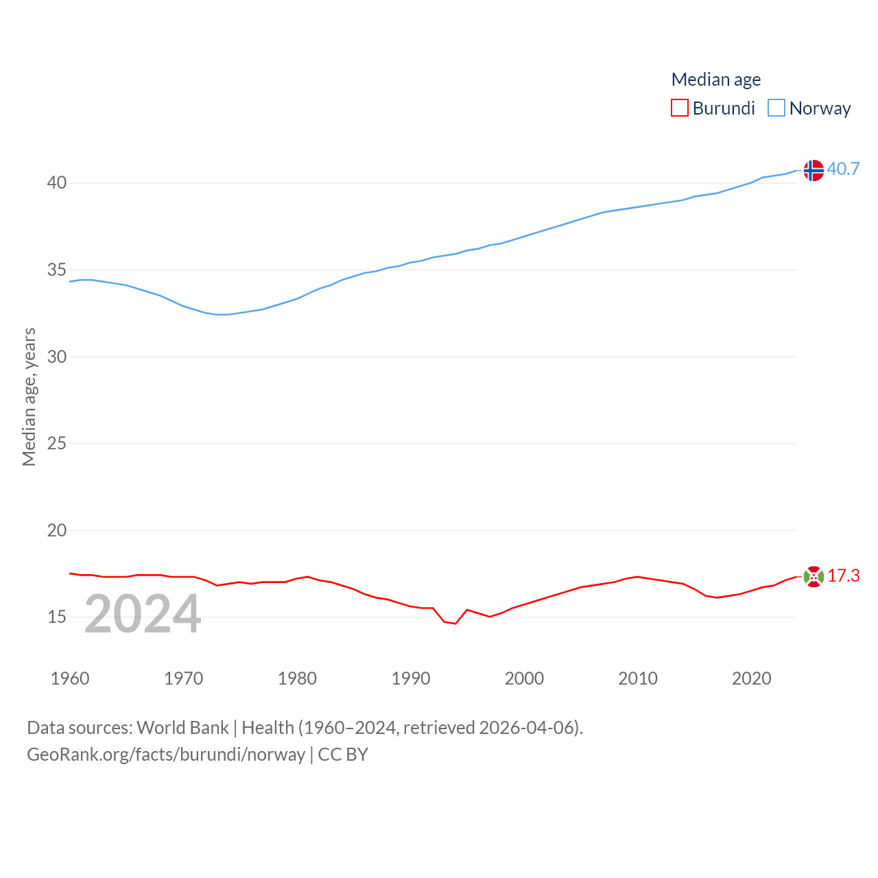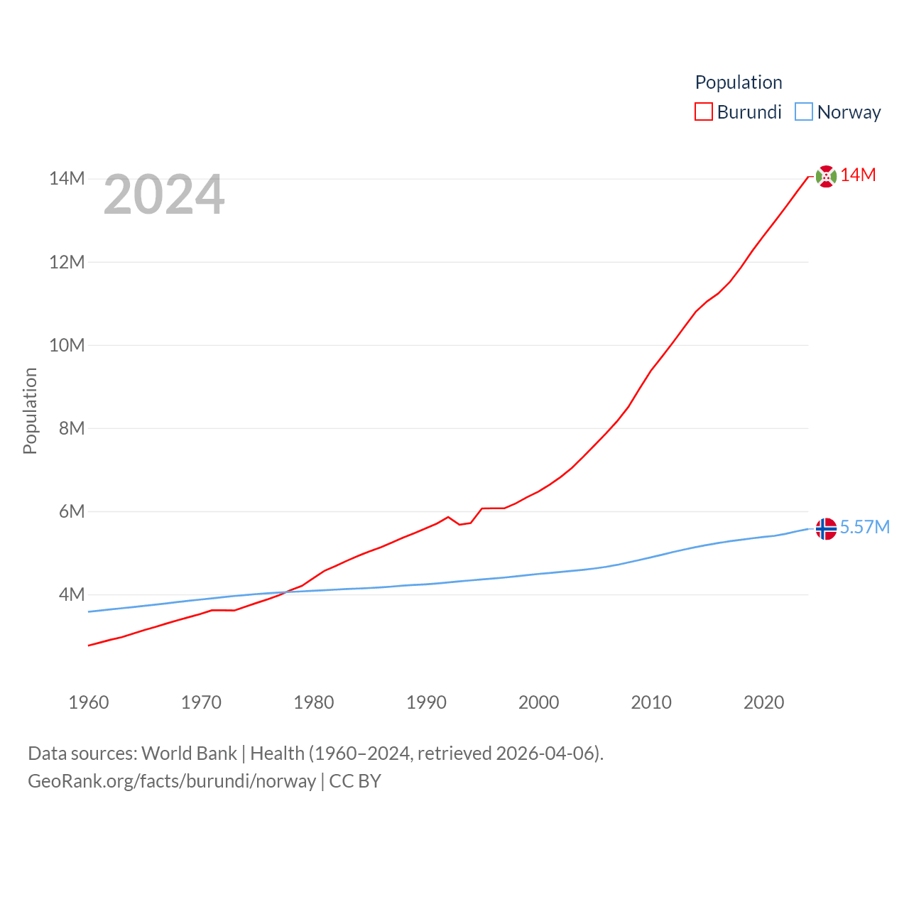 Burundi has a population of 14M (ranked 78/197), compared with 5.57M in Norway (ranked 118/197). Burundi's land area is 9,915 sq mi versus 140,645 sq mi for Norway (ranked 144th vs. 62nd).