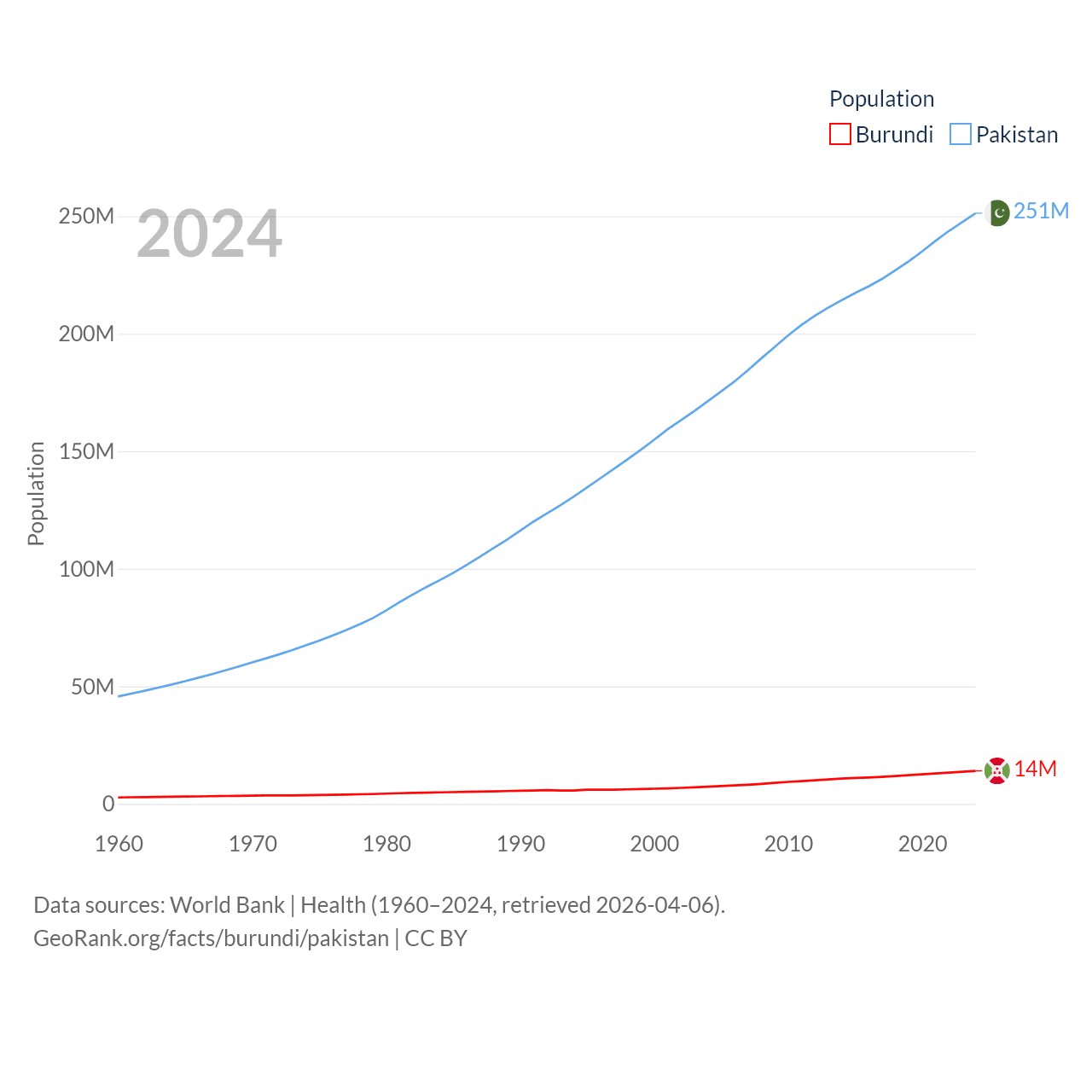 Burundi has a population of 14M (ranked 78/197), compared with 251M in Pakistan (ranked 5/197). Burundi's land area is 9,915 sq mi versus 297,638 sq mi for Pakistan (ranked 144th vs. 35th).