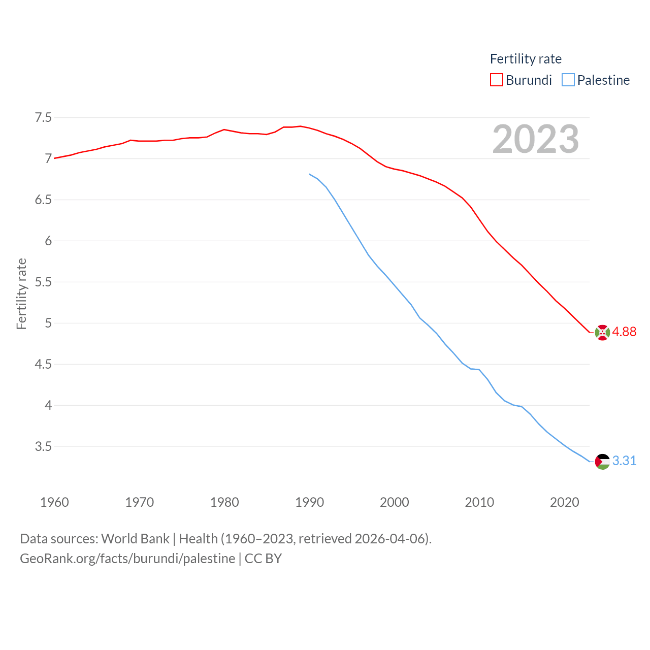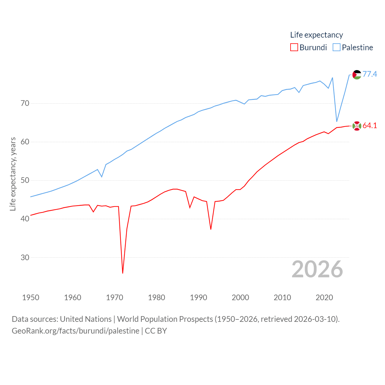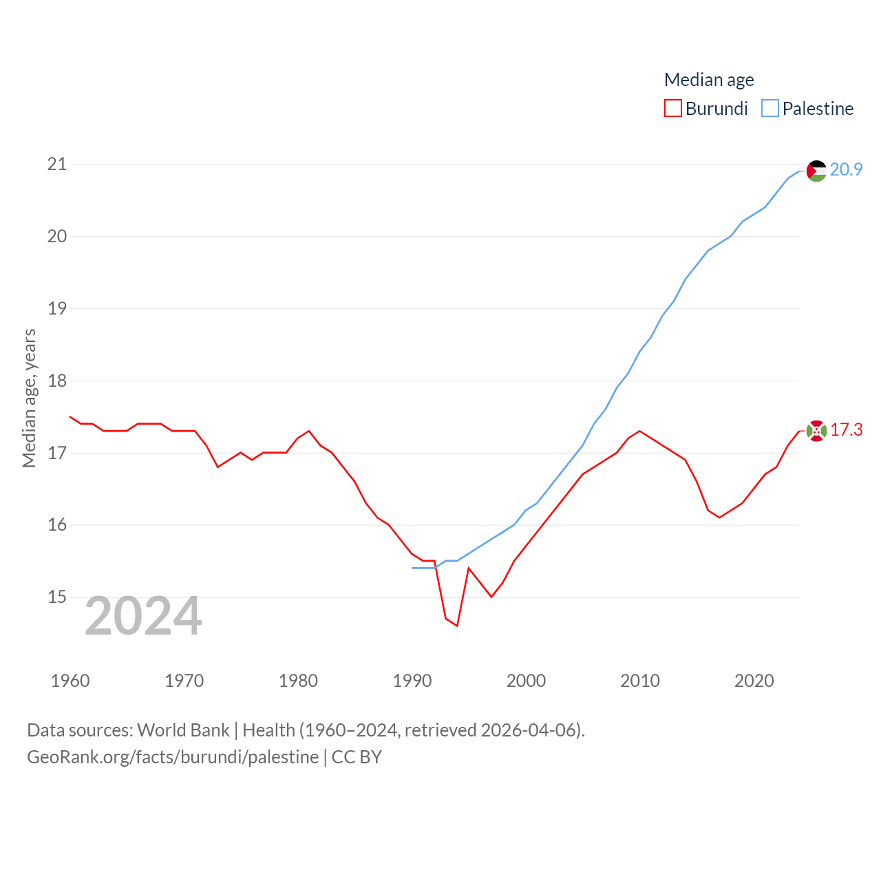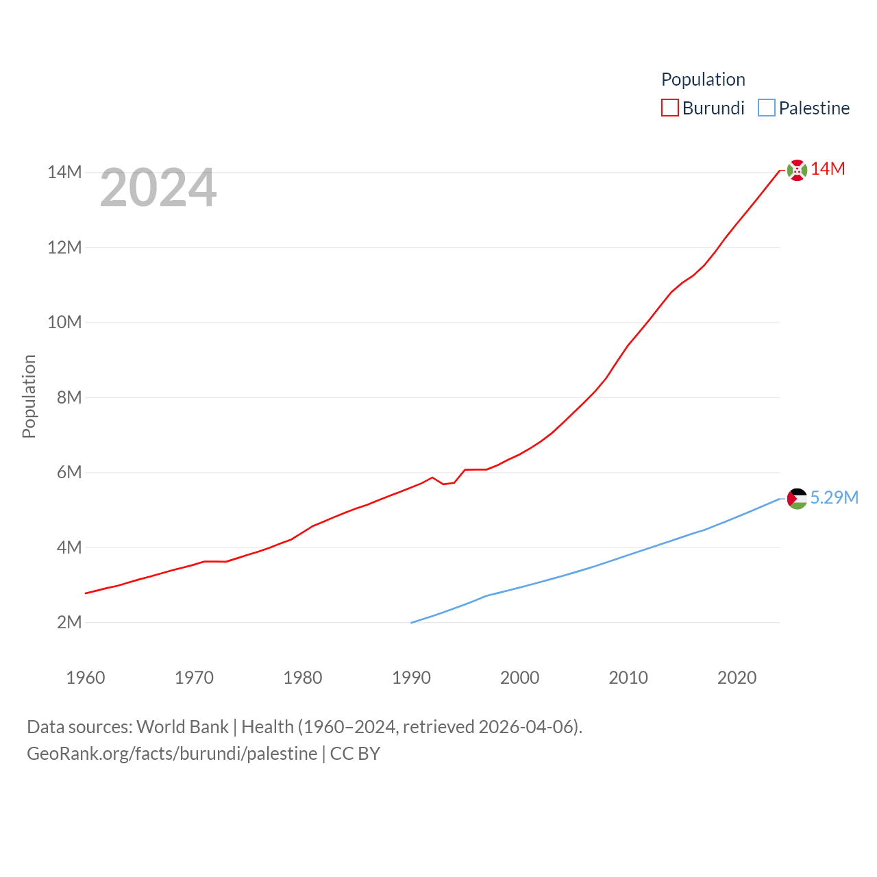 Burundi has a population of 14M (ranked 78/197), compared with 5.29M in Palestine (ranked 122/197). Burundi's land area is 9,915 sq mi versus 2,326 sq mi for Palestine (ranked 144th vs. 164th).