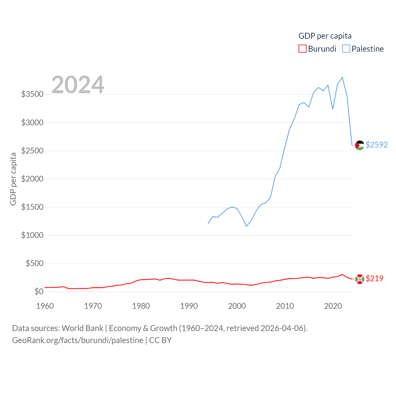 By GDP, Burundi ranks 169/197 ($3.08B) and Palestine ranks 146/197 ($13.7B). By GDP per capita, Burundi ranks 197/197 ($219.4), while Palestine ranks 147/197 ($2,592).