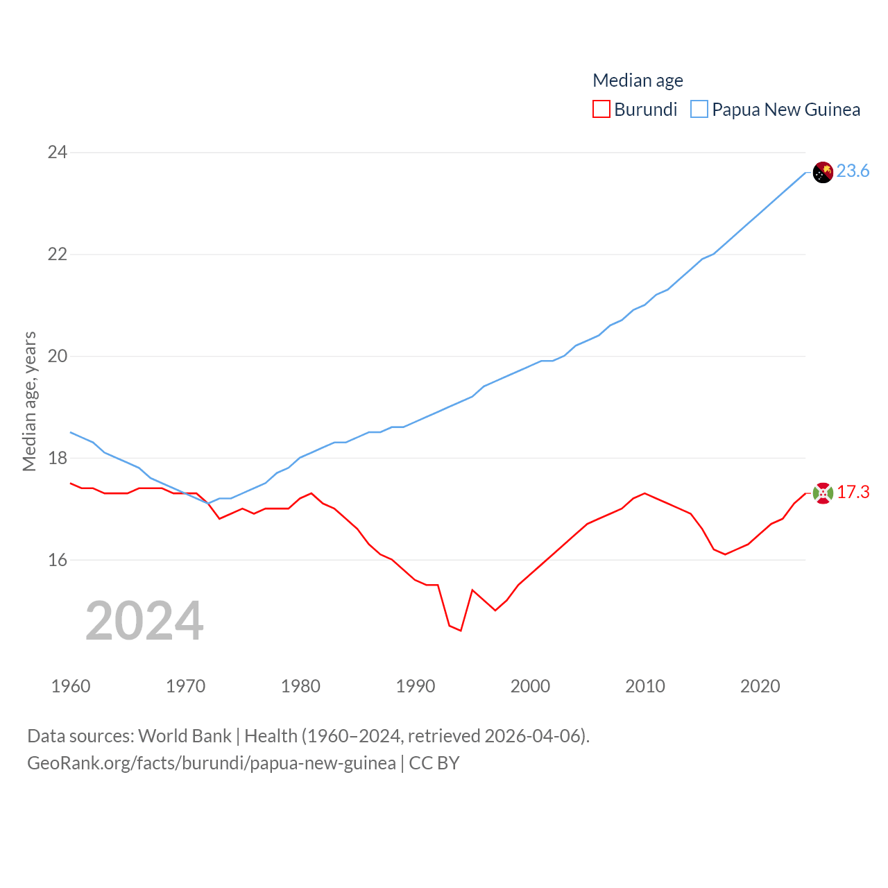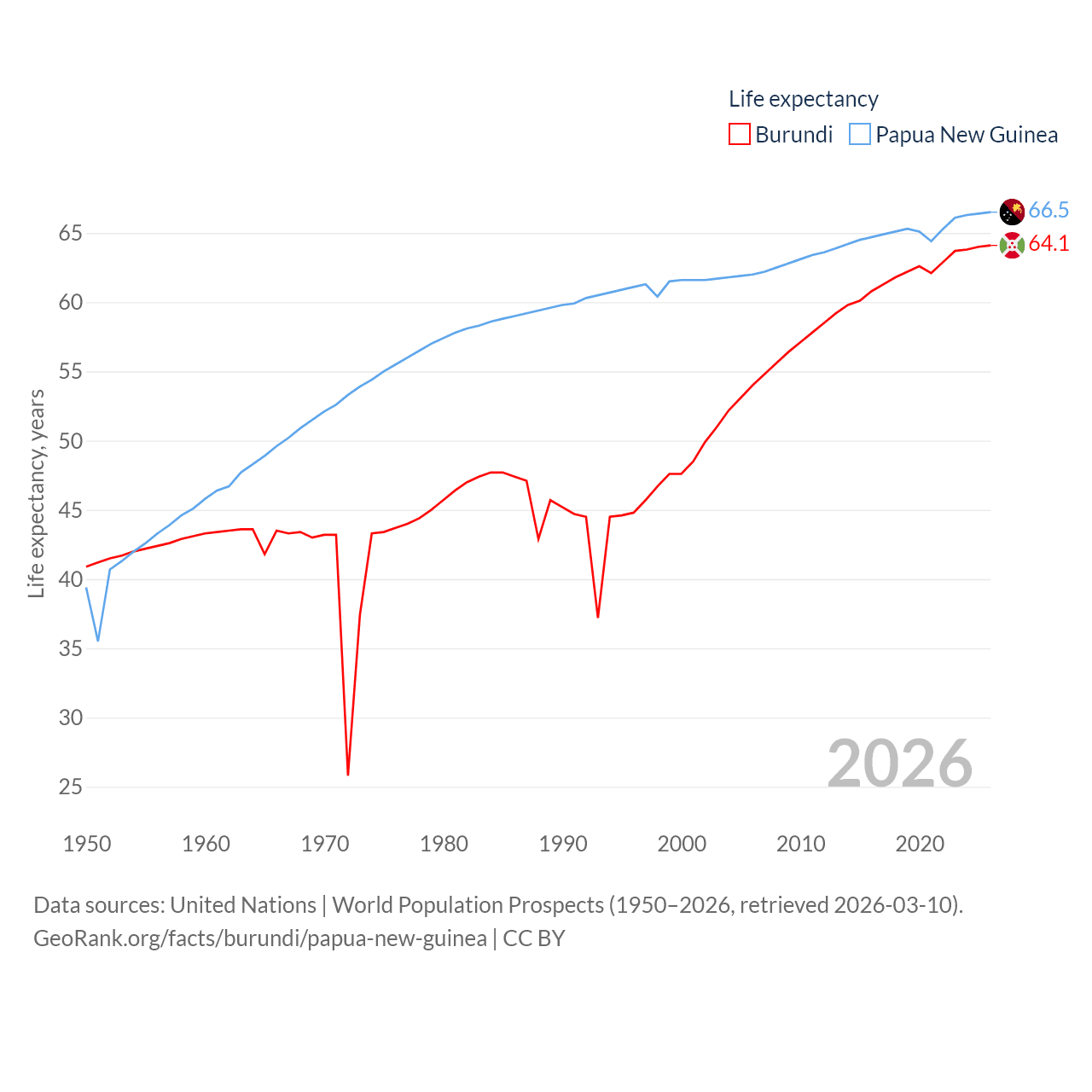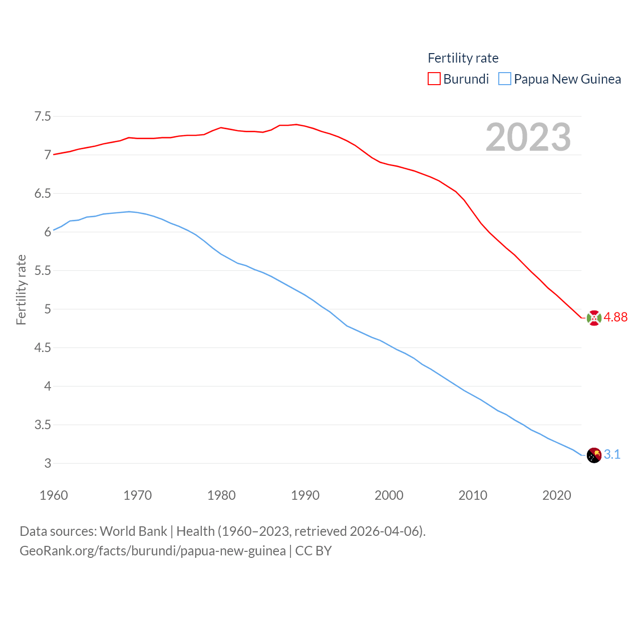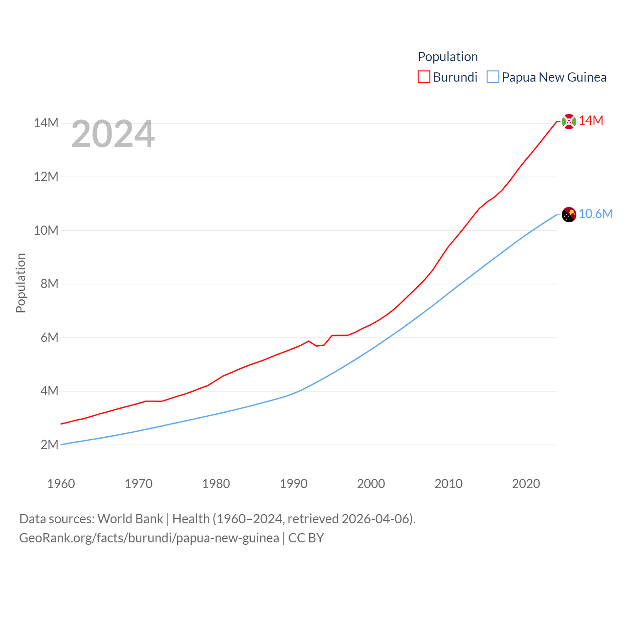 Burundi has a population of 14M (ranked 78/197), compared with 10.6M in Papua New Guinea (ranked 92/197). Burundi's land area is 9,915 sq mi versus 174,850 sq mi for Papua New Guinea (ranked 144th vs. 54th).