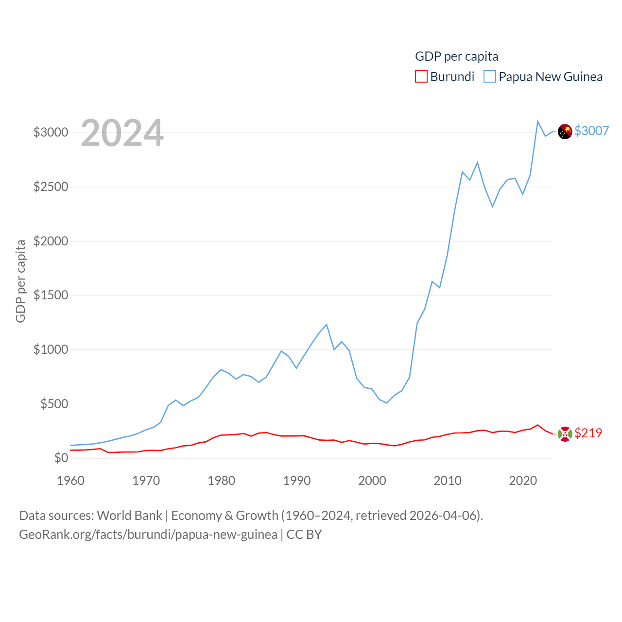 By GDP, Burundi ranks 169/197 ($3.08B) and Papua New Guinea ranks 110/197 ($31.8B). By GDP per capita, Burundi ranks 197/197 ($219.4), while Papua New Guinea ranks 140/197 ($3,007).