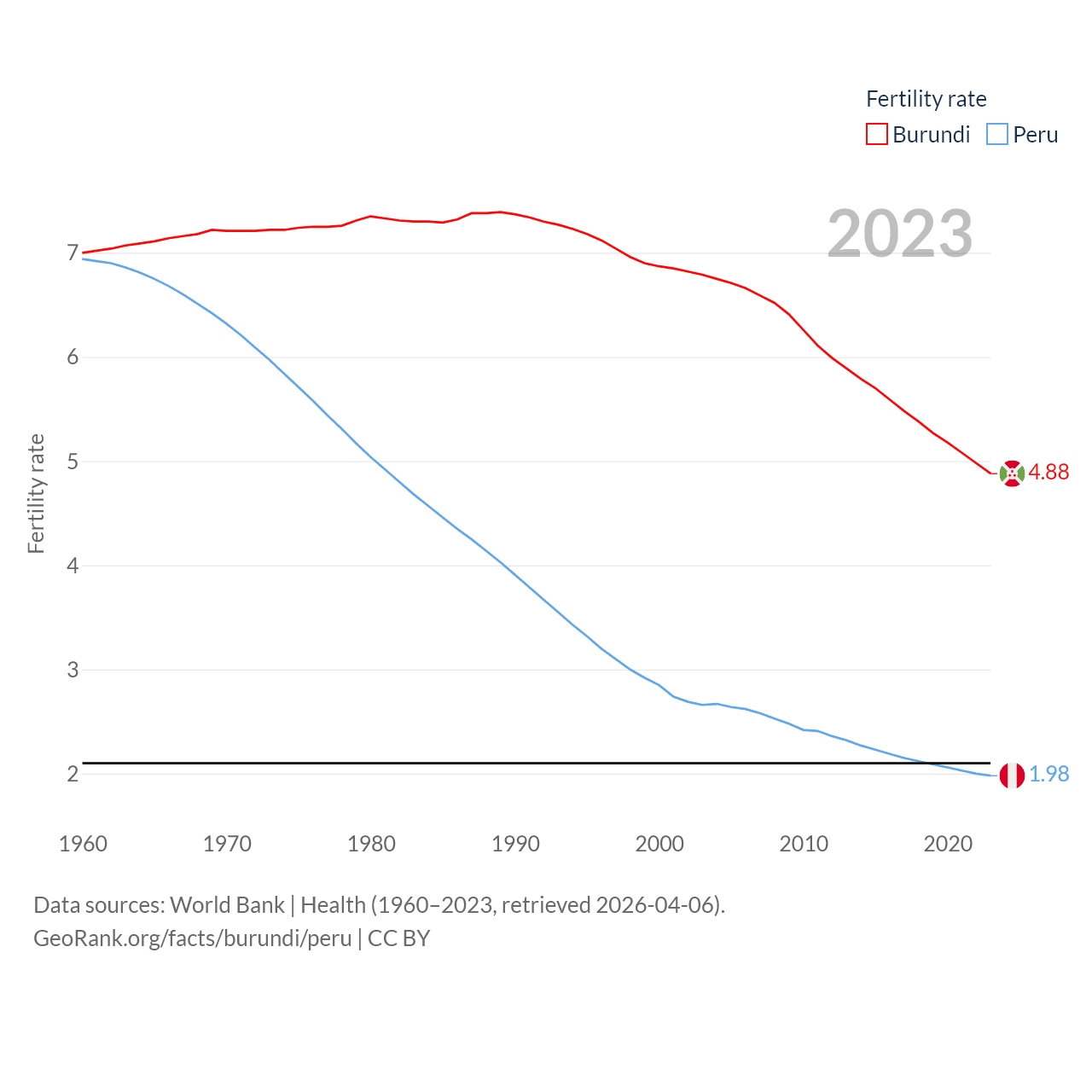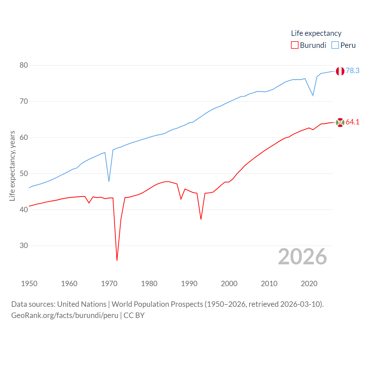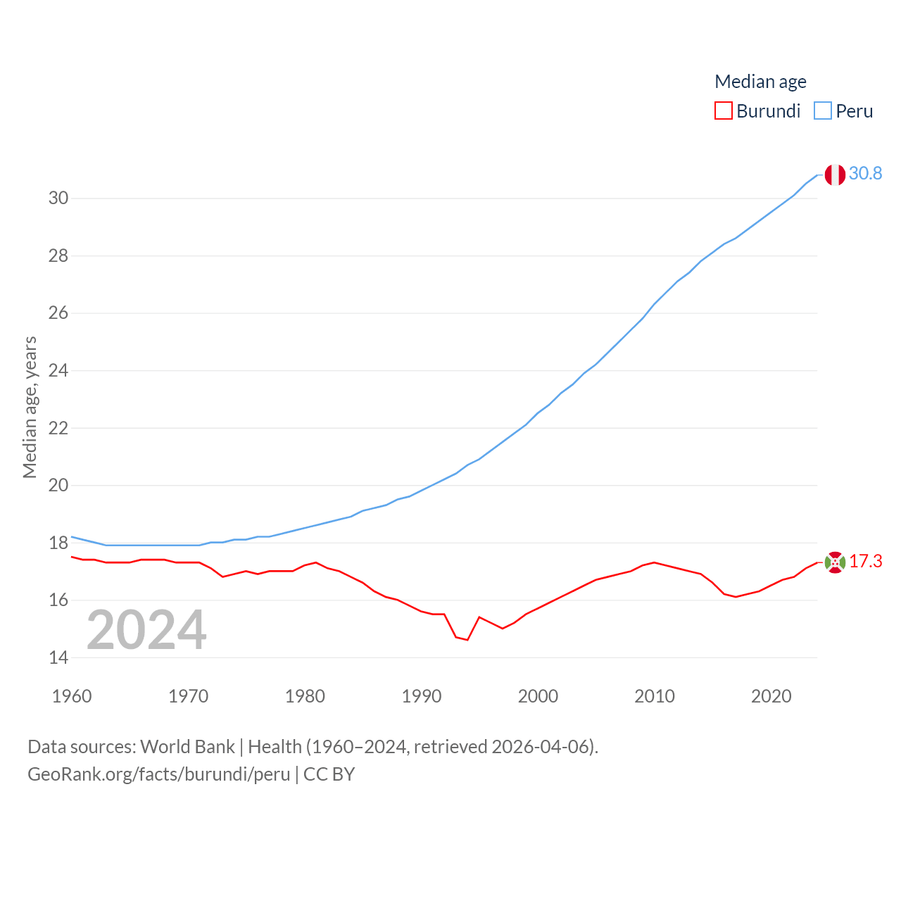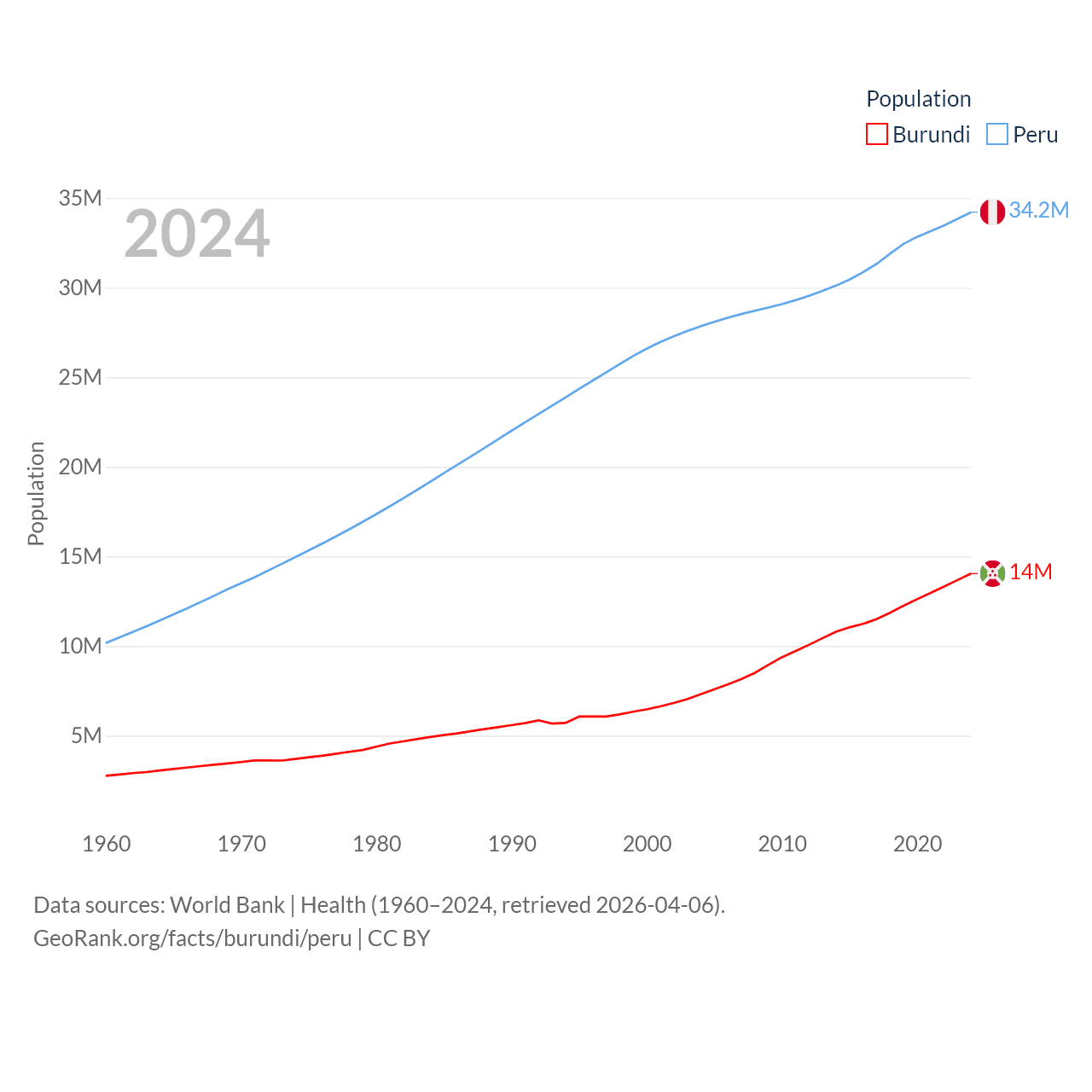 Burundi has a population of 14M (ranked 78/197), compared with 34.2M in Peru (ranked 48/197). Burundi's land area is 9,915 sq mi versus 494,211 sq mi for Peru (ranked 144th vs. 19th).