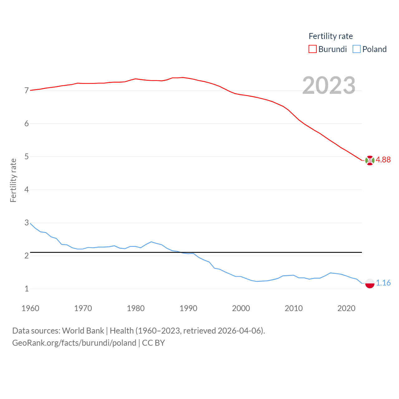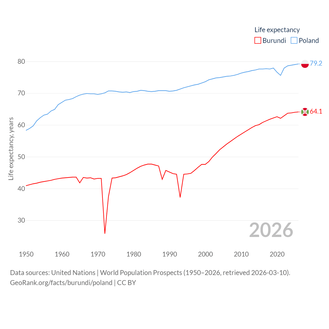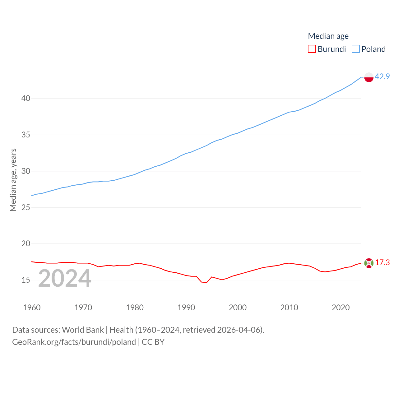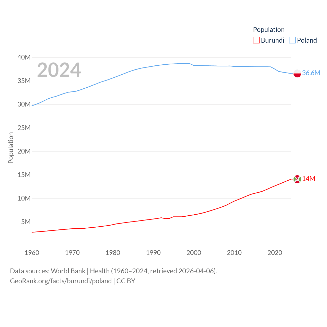 Burundi has a population of 14M (ranked 78/197), compared with 36.6M in Poland (ranked 42/197). Burundi's land area is 9,915 sq mi versus 118,252 sq mi for Poland (ranked 144th vs. 69th).