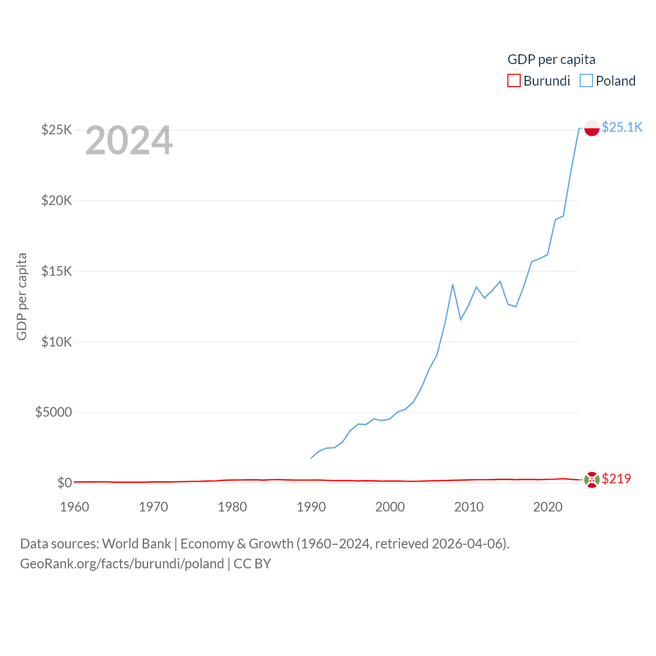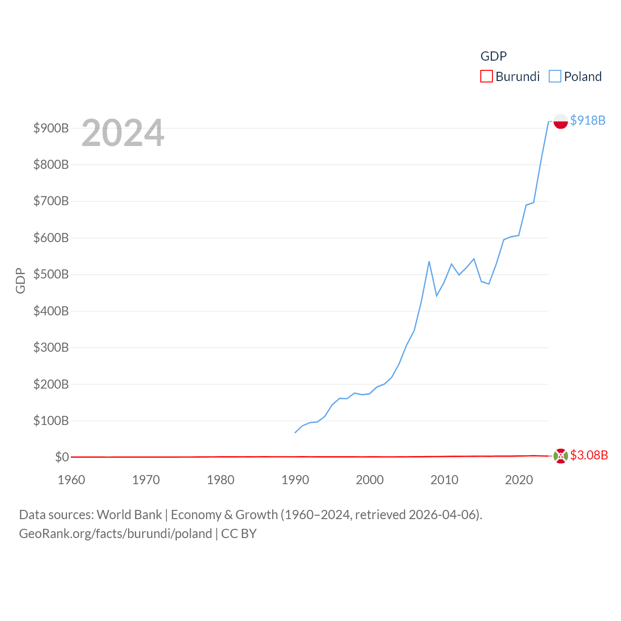 By GDP, Burundi ranks 169/197 ($3.08B) and Poland ranks 21/197 ($918B). By GDP per capita, Burundi ranks 197/197 ($219.4), while Poland ranks 48/197 ($25,104).