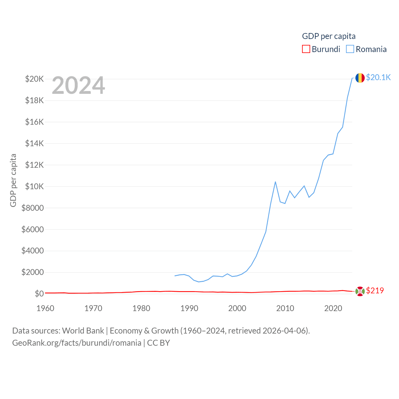 By GDP, Burundi ranks 169/197 ($3.08B) and Romania ranks 42/197 ($383B). By GDP per capita, Burundi ranks 197/197 ($219.4), while Romania ranks 58/197 ($20,080).