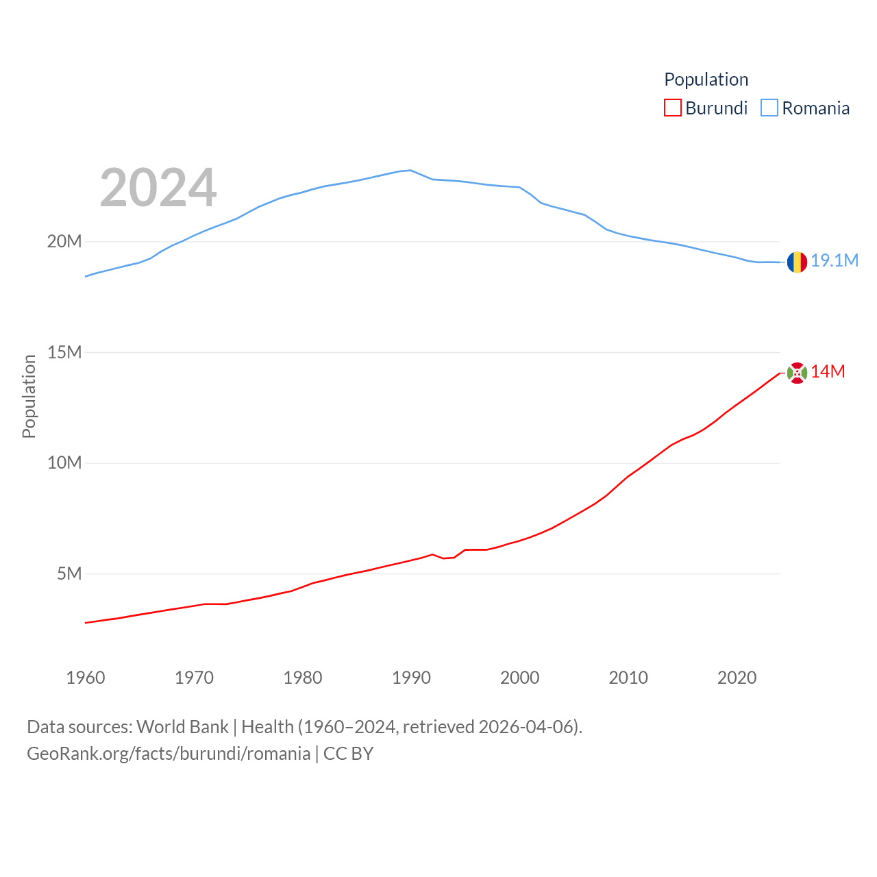 Burundi has a population of 14M (ranked 78/197), compared with 19.1M in Romania (ranked 67/197). Burundi's land area is 9,915 sq mi versus 88,834 sq mi for Romania (ranked 144th vs. 80th).