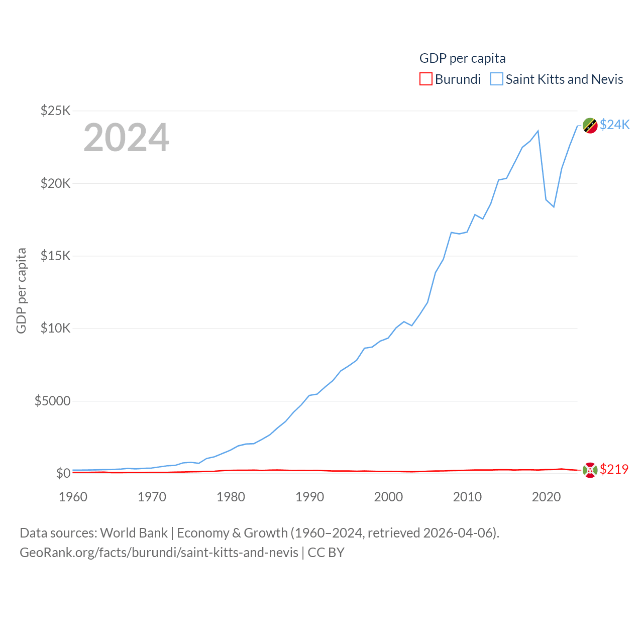 By GDP, Burundi ranks 169/197 ($3.08B) and Saint Kitts and Nevis ranks 187/197 ($1.12B). By GDP per capita, Burundi ranks 197/197 ($219.4), while Saint Kitts and Nevis ranks 51/197 ($23,961).