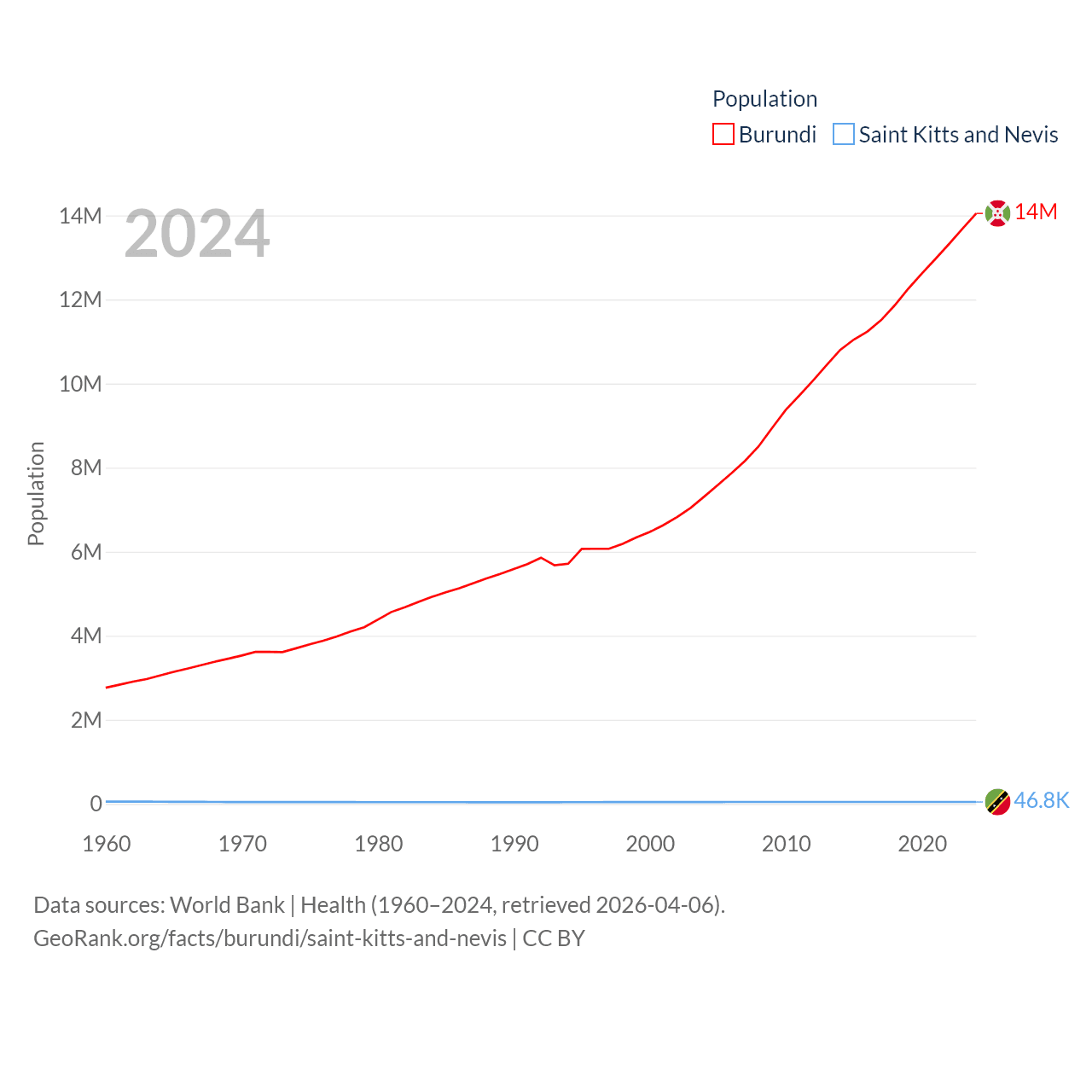 Burundi has a population of 14M (ranked 78/197), compared with 46.8K in Saint Kitts and Nevis (ranked 189/197). Burundi's land area is 9,915 sq mi versus 100.4 sq mi for Saint Kitts and Nevis (ranked 144th vs. 189th).