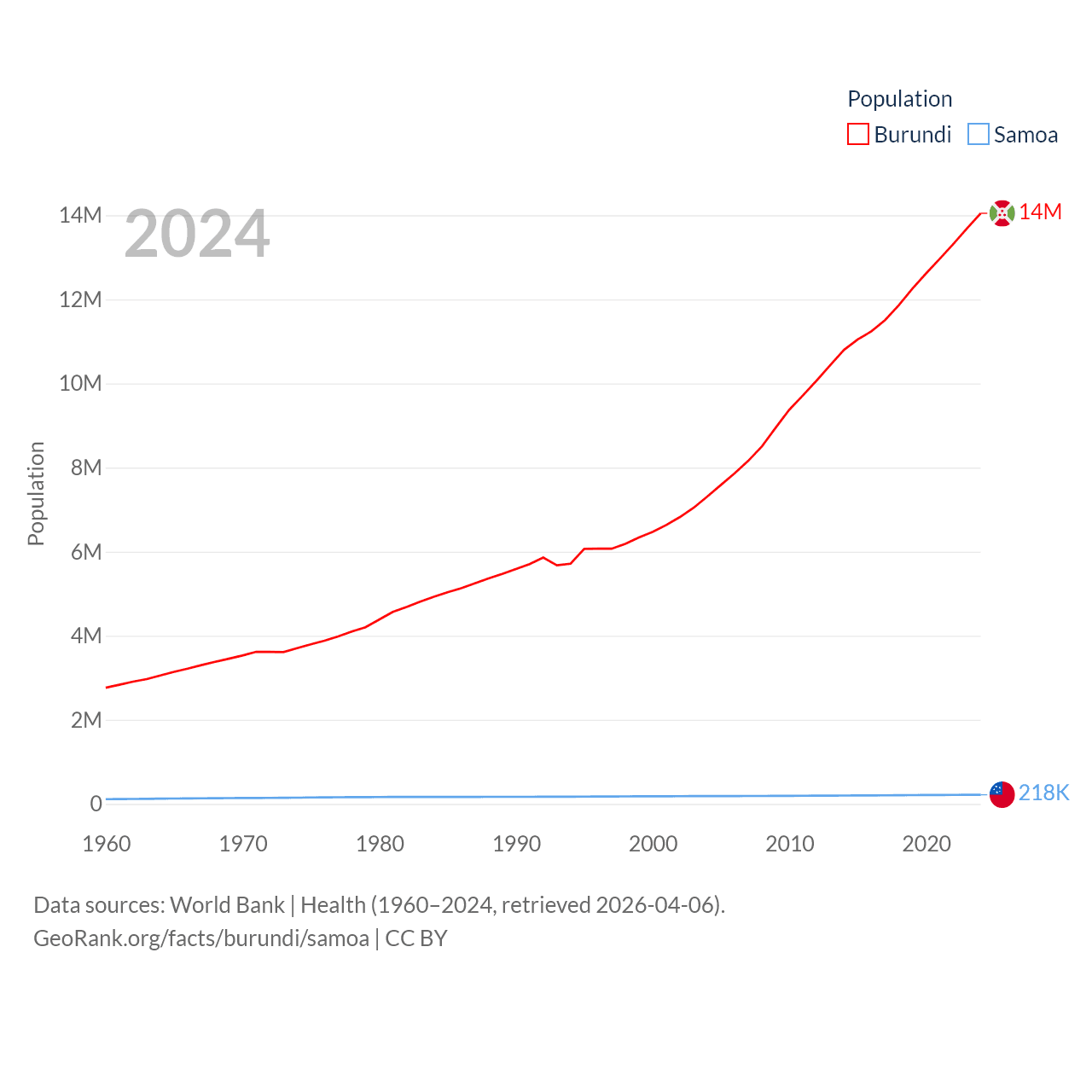 Burundi has a population of 14M (ranked 78/197), compared with 218K in Samoa (ranked 177/197). Burundi's land area is 9,915 sq mi versus 1,073 sq mi for Samoa (ranked 144th vs. 168th).