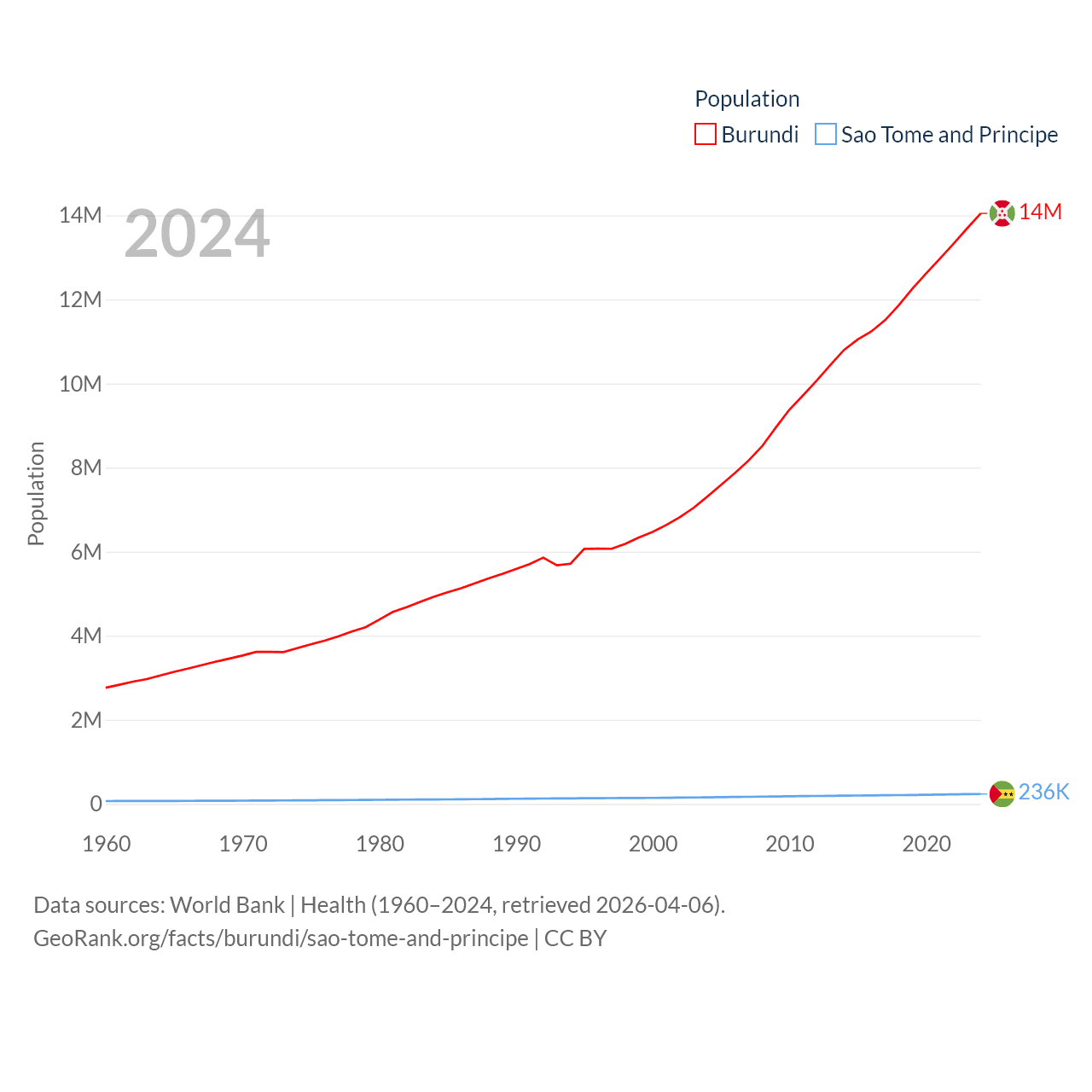 Burundi has a population of 14M (ranked 78/197), compared with 236K in Sao Tome and Principe (ranked 176/197). Burundi's land area is 9,915 sq mi versus 371 sq mi for Sao Tome and Principe (ranked 144th vs. 172nd).