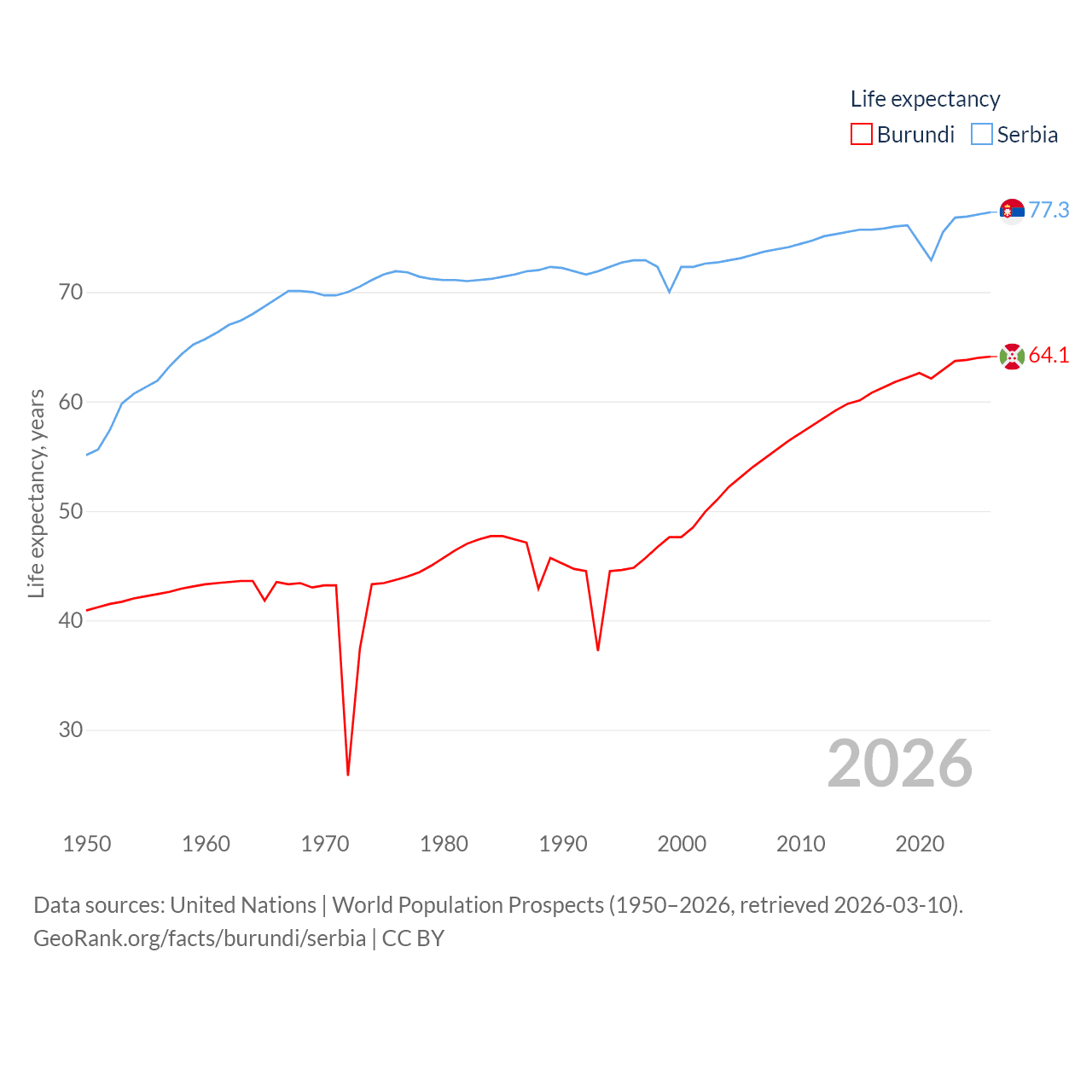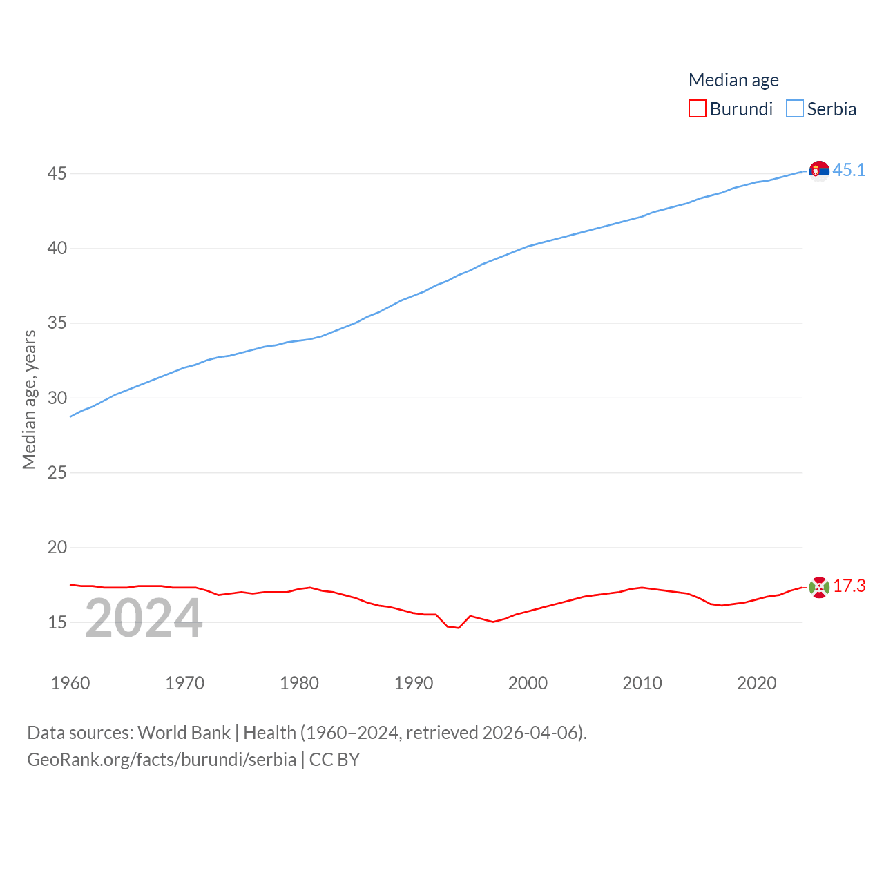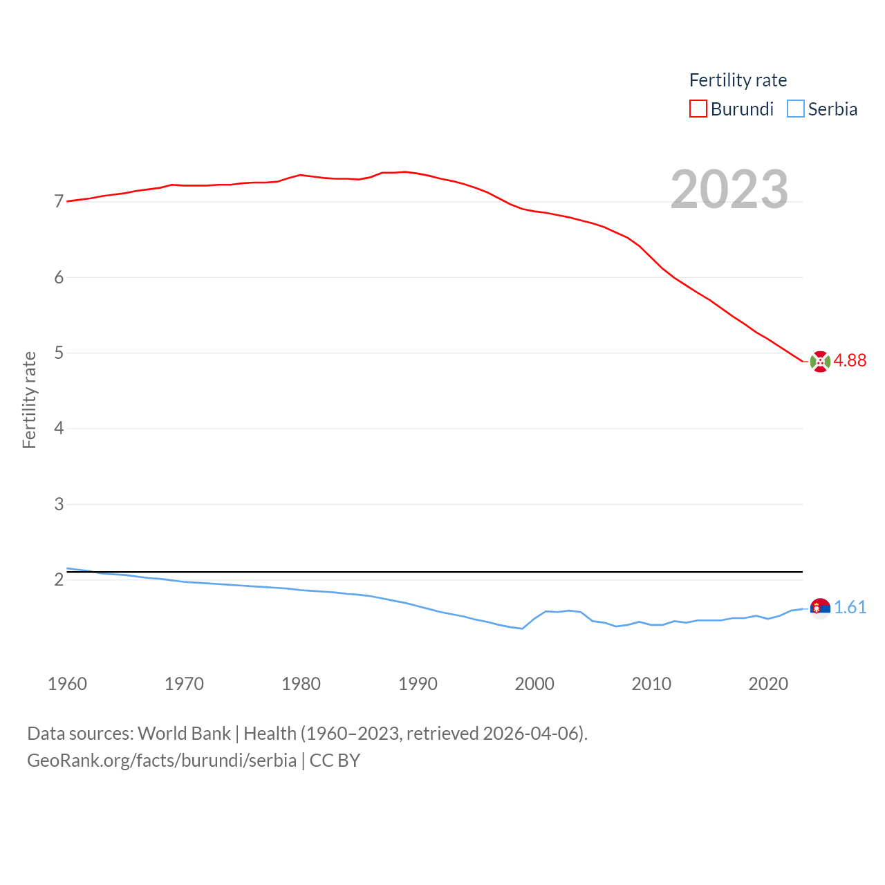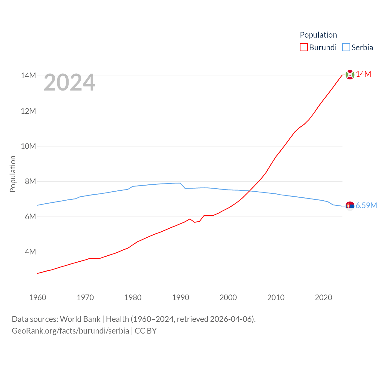 Burundi has a population of 14M (ranked 78/197), compared with 6.59M in Serbia (ranked 109/197). Burundi's land area is 9,915 sq mi versus 32,467 sq mi for Serbia (ranked 144th vs. 111th).
