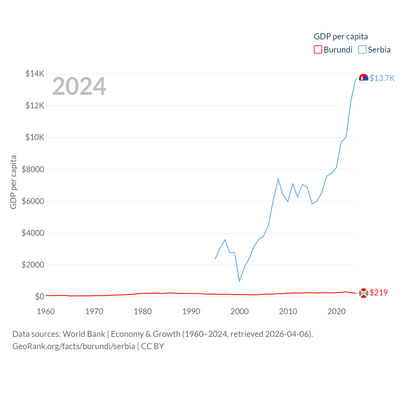 By GDP, Burundi ranks 169/197 ($3.08B) and Serbia ranks 76/197 ($90.1B). By GDP per capita, Burundi ranks 197/197 ($219.4), while Serbia ranks 73/197 ($13,679).