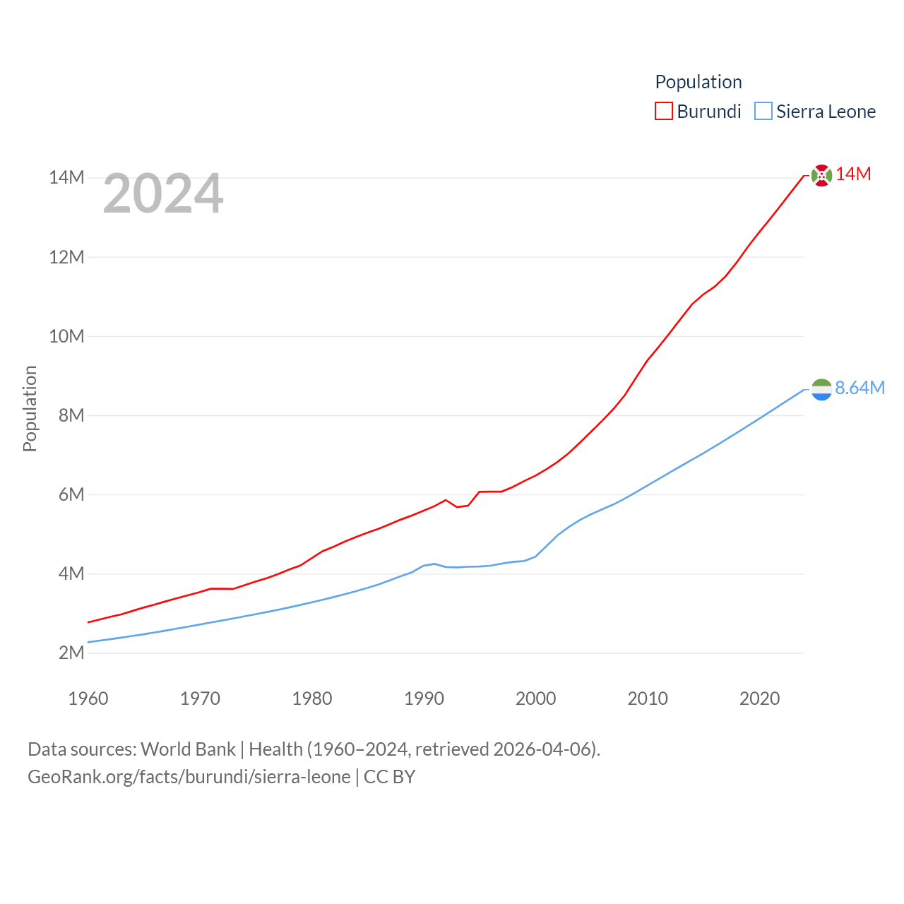 Burundi has a population of 14M (ranked 78/197), compared with 8.64M in Sierra Leone (ranked 102/197). Burundi's land area is 9,915 sq mi versus 27,869 sq mi for Sierra Leone (ranked 144th vs. 116th).