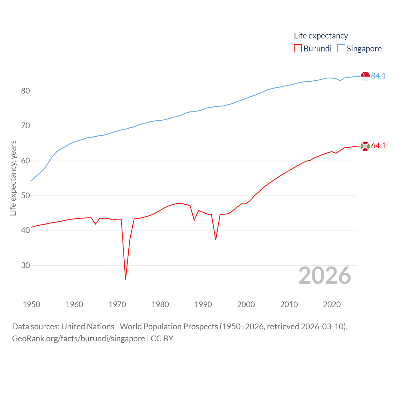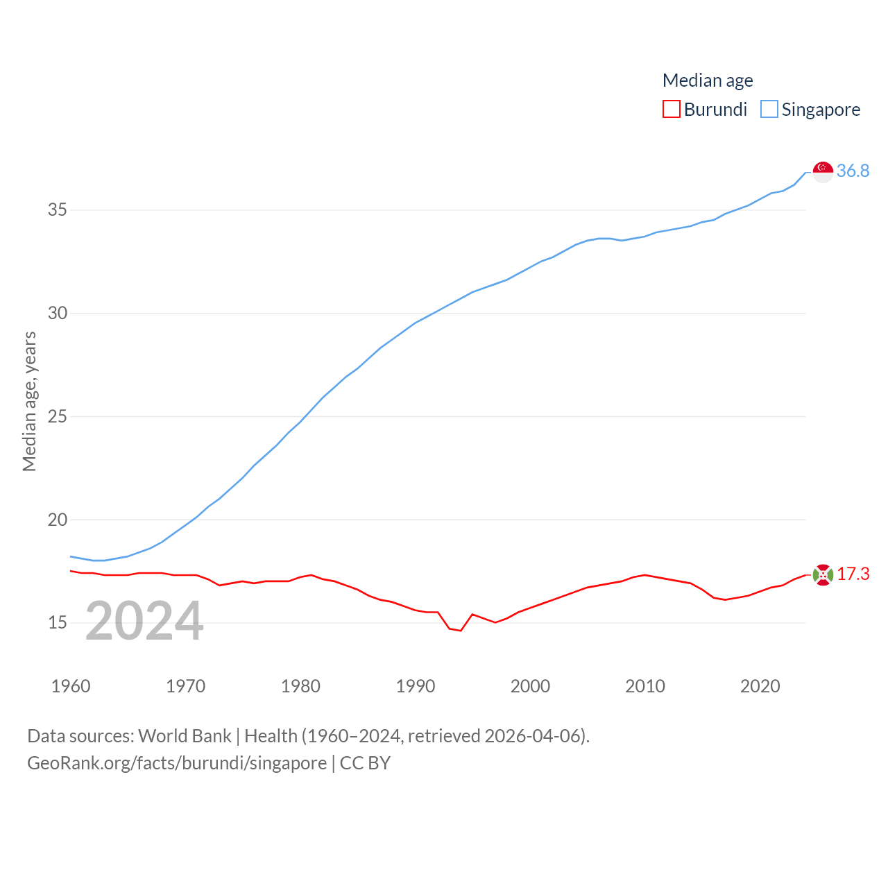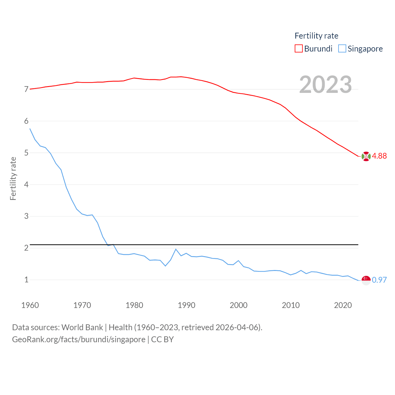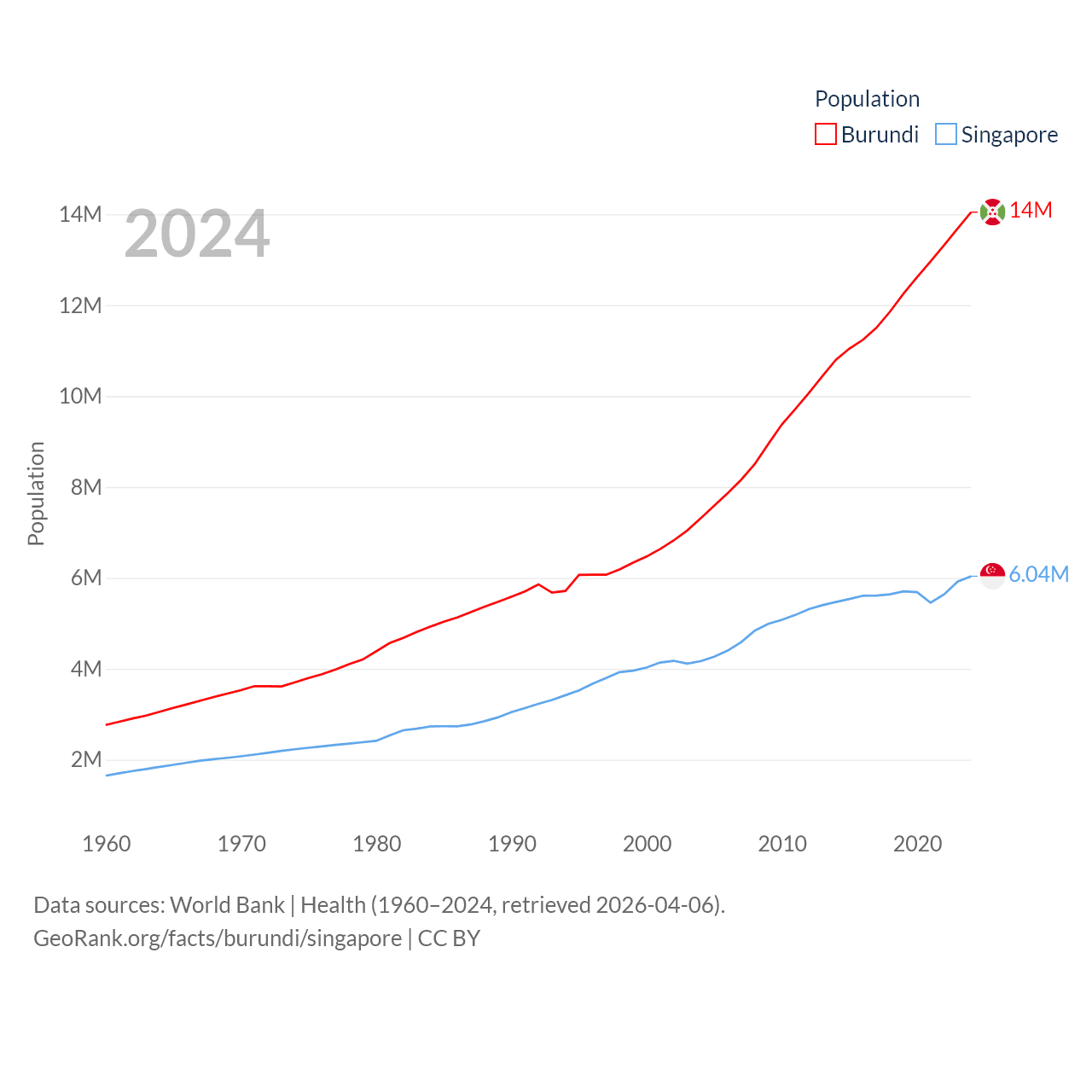 Burundi has a population of 14M (ranked 78/197), compared with 6.04M in Singapore (ranked 113/197). Burundi's land area is 9,915 sq mi versus 277.2 sq mi for Singapore (ranked 144th vs. 177th).