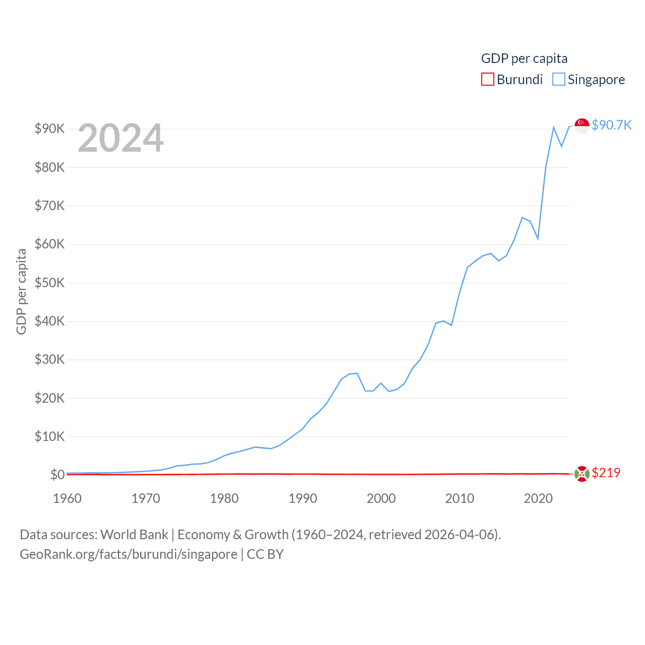 By GDP, Burundi ranks 169/197 ($3.08B) and Singapore ranks 28/197 ($547B). By GDP per capita, Burundi ranks 197/197 ($219.4), while Singapore ranks 7/197 ($90,674).