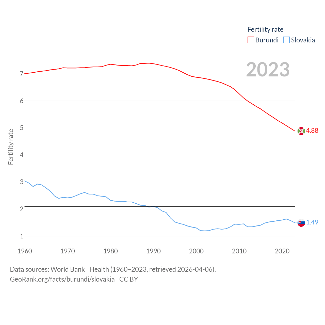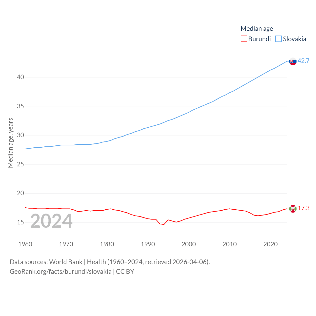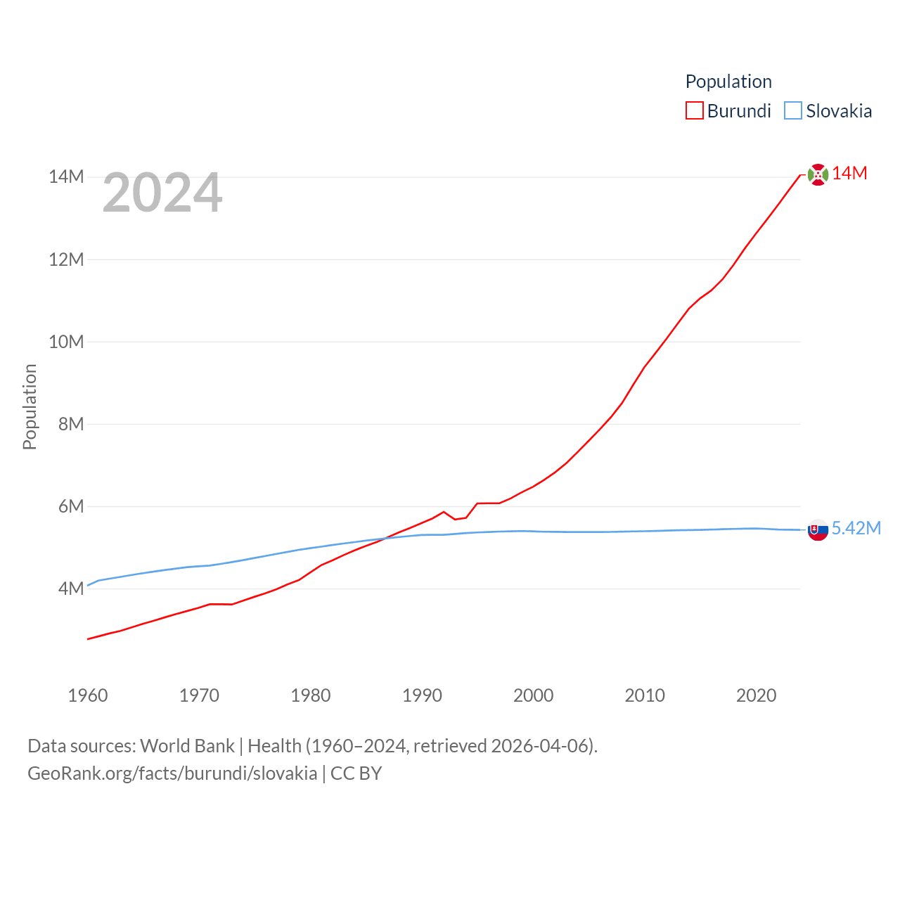 Burundi has a population of 14M (ranked 78/197), compared with 5.42M in Slovakia (ranked 119/197). Burundi's land area is 9,915 sq mi versus 18,564 sq mi for Slovakia (ranked 144th vs. 128th).
