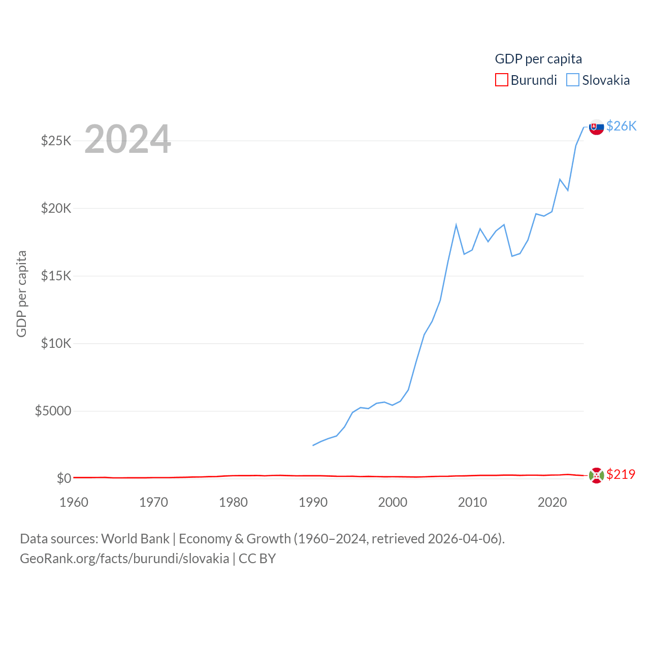 By GDP, Burundi ranks 169/197 ($3.08B) and Slovakia ranks 61/197 ($141B). By GDP per capita, Burundi ranks 197/197 ($219.4), while Slovakia ranks 47/197 ($25,993).