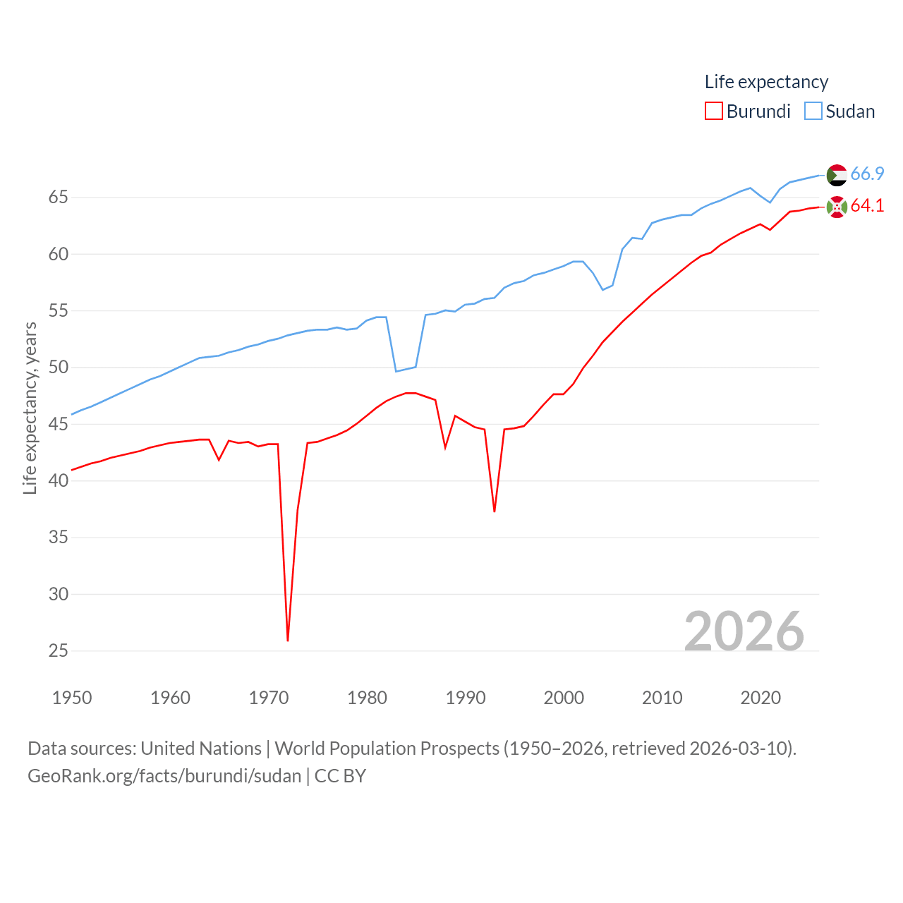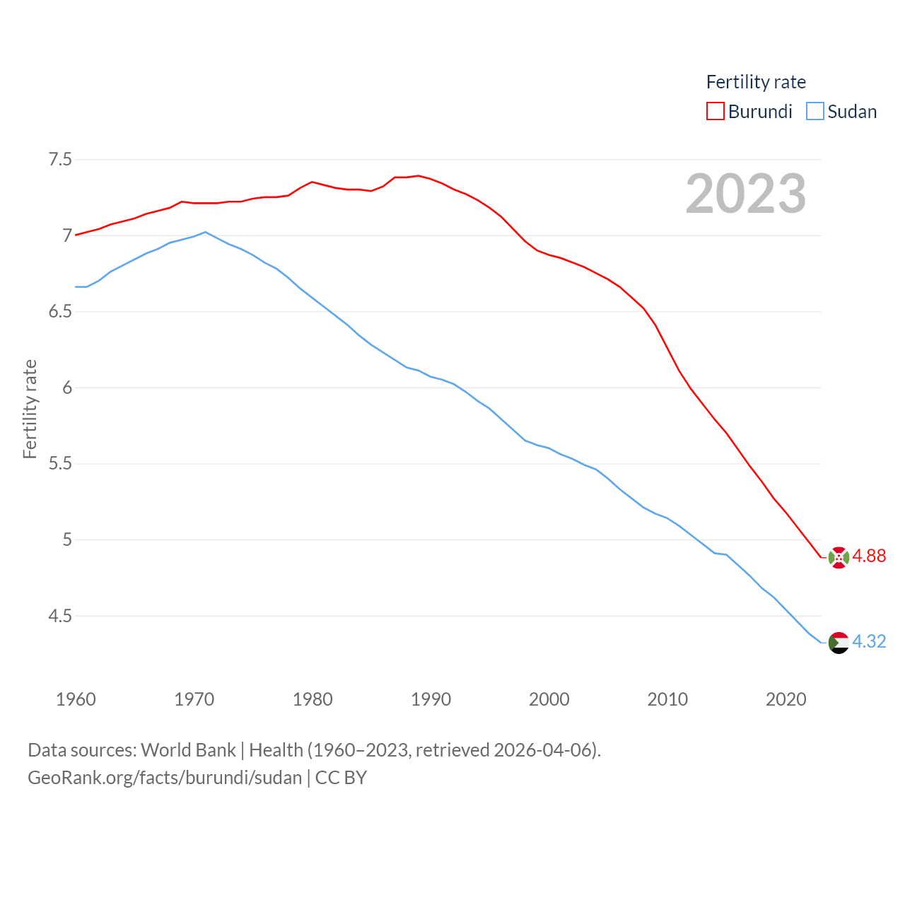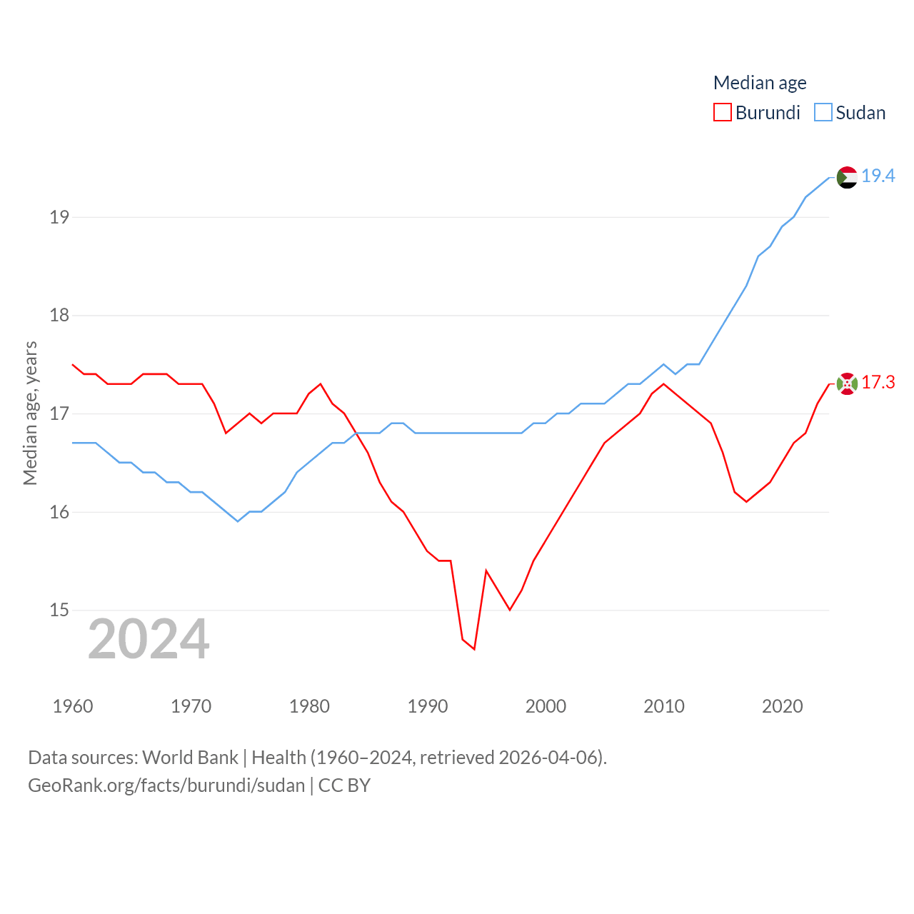Burundi has a population of 14M (ranked 78/197), compared with 50.4M in Sudan (ranked 30/197). Burundi's land area is 9,915 sq mi versus 721,239 sq mi for Sudan (ranked 144th vs. 15th).