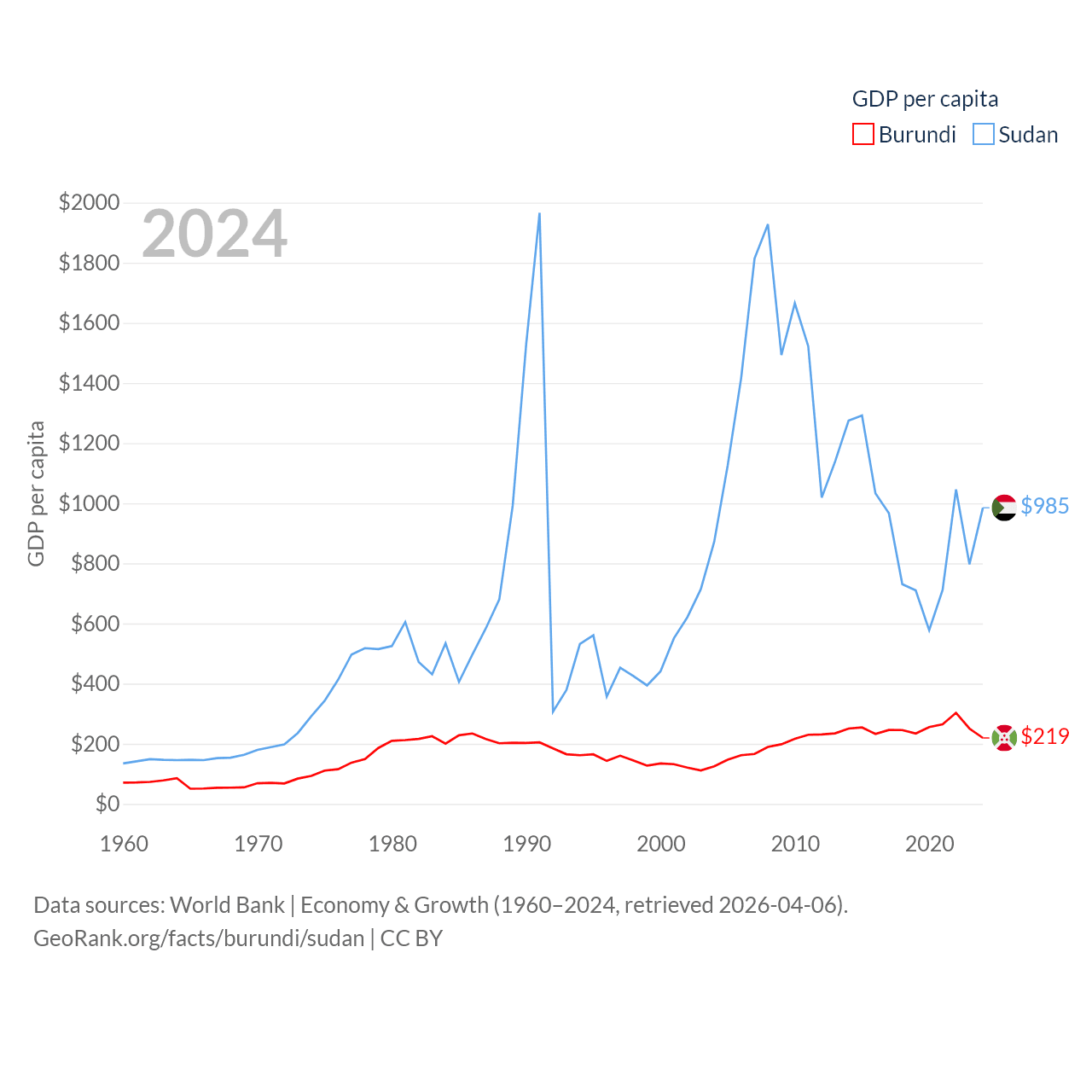 By GDP, Burundi ranks 169/197 ($3.08B) and Sudan ranks 94/197 ($49.7B). By GDP per capita, Burundi ranks 197/197 ($219.4), while Sudan ranks 179/197 ($985).