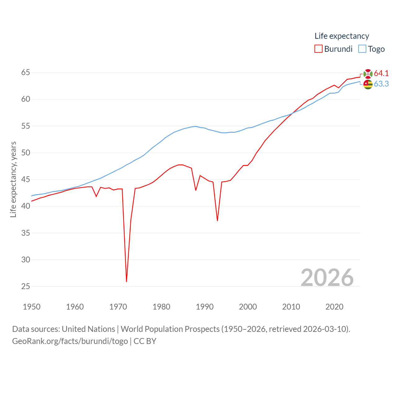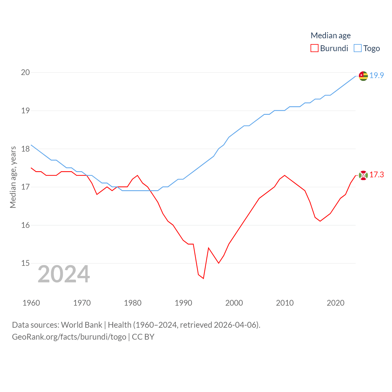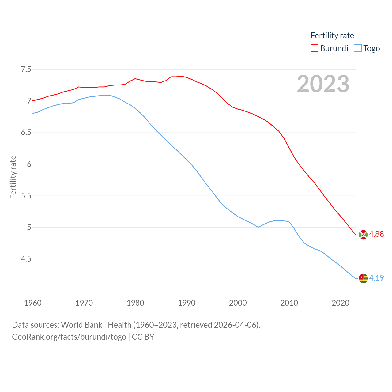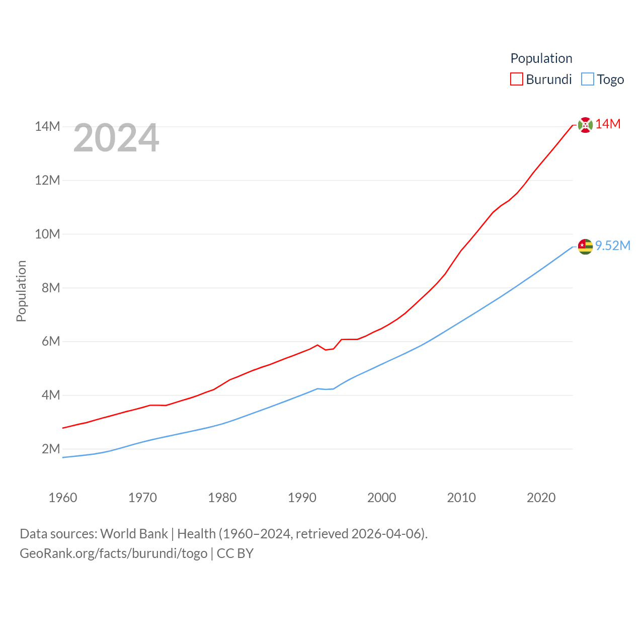 Burundi has a population of 14M (ranked 78/197), compared with 9.52M in Togo (ranked 98/197). Burundi's land area is 9,915 sq mi versus 21,000 sq mi for Togo (ranked 144th vs. 124th).
