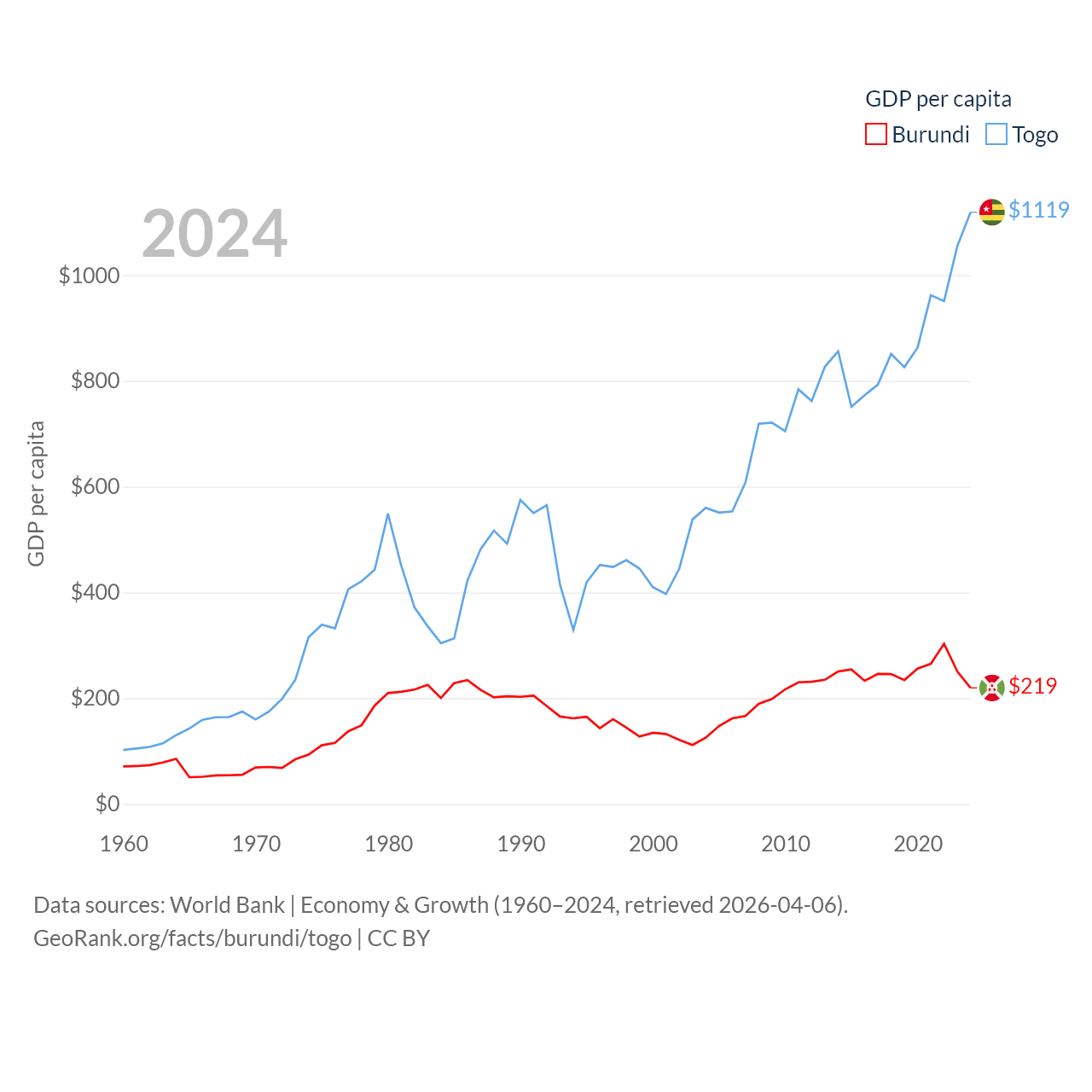 By GDP, Burundi ranks 169/197 ($3.08B) and Togo ranks 154/197 ($10.7B). By GDP per capita, Burundi ranks 197/197 ($219.4), while Togo ranks 172/197 ($1,119).