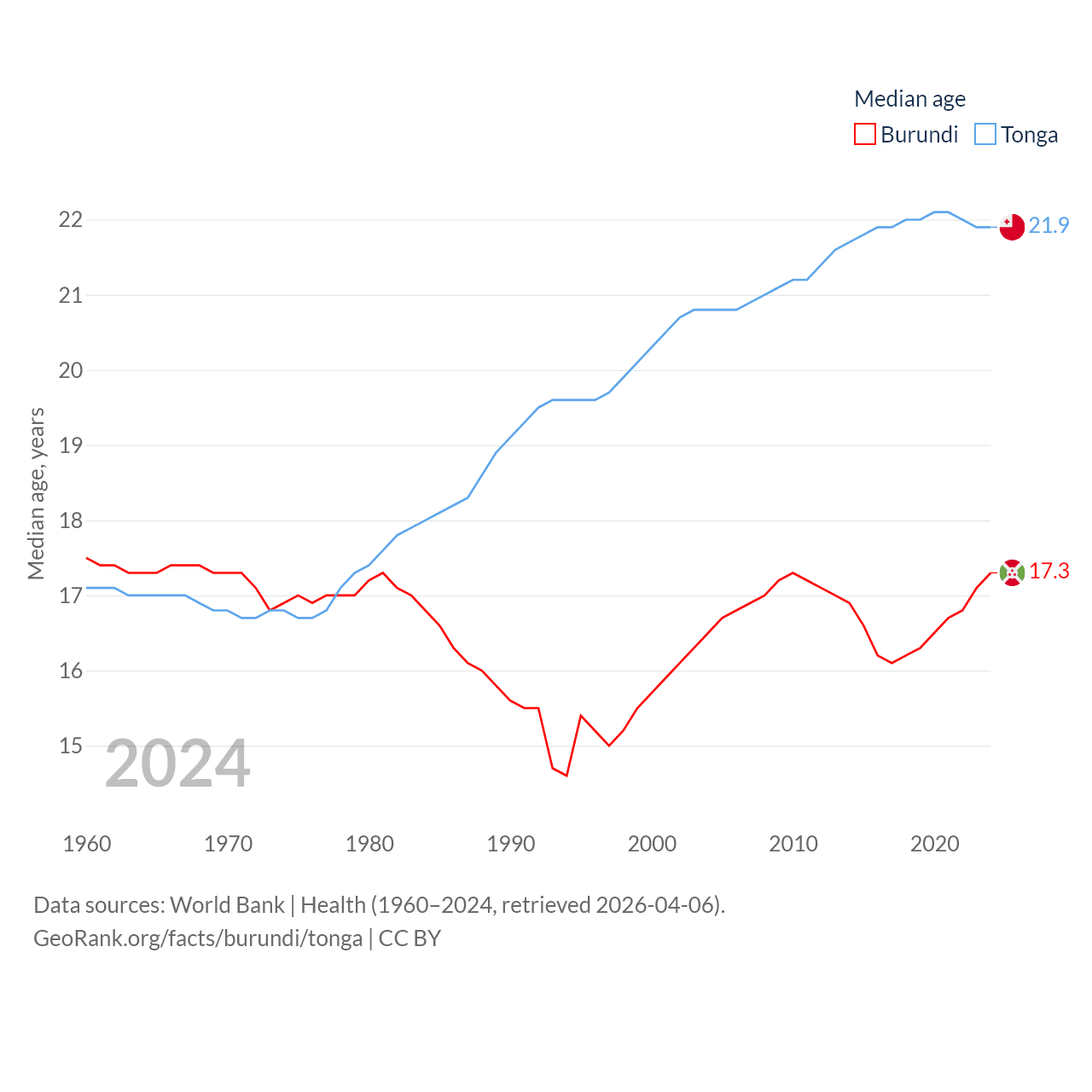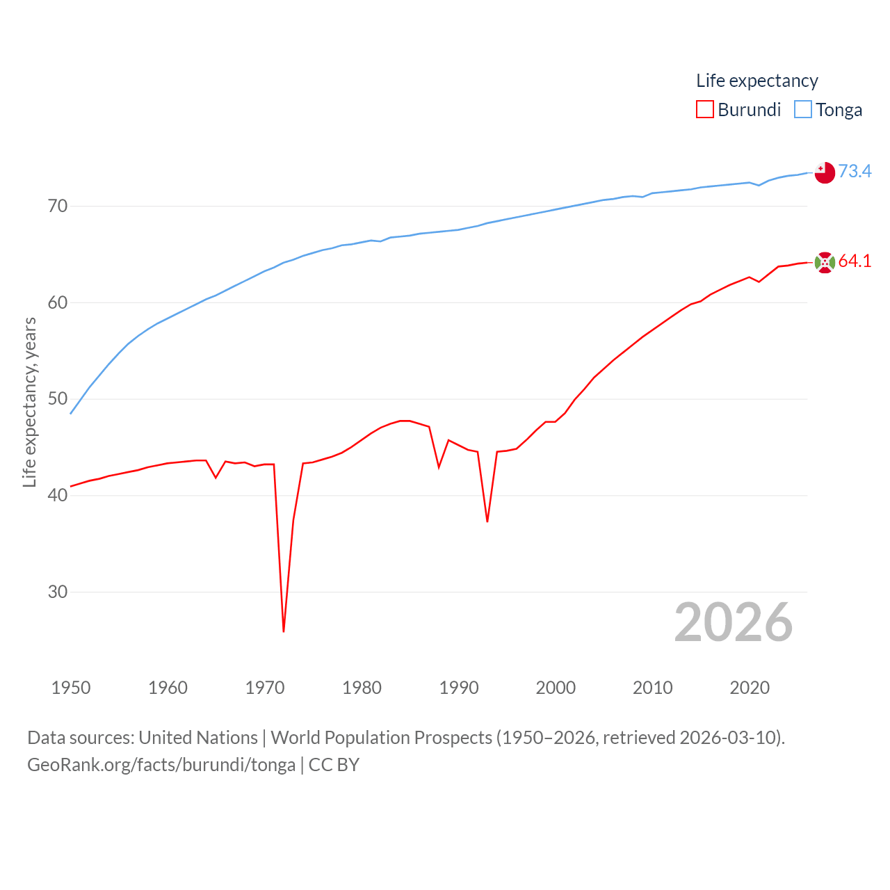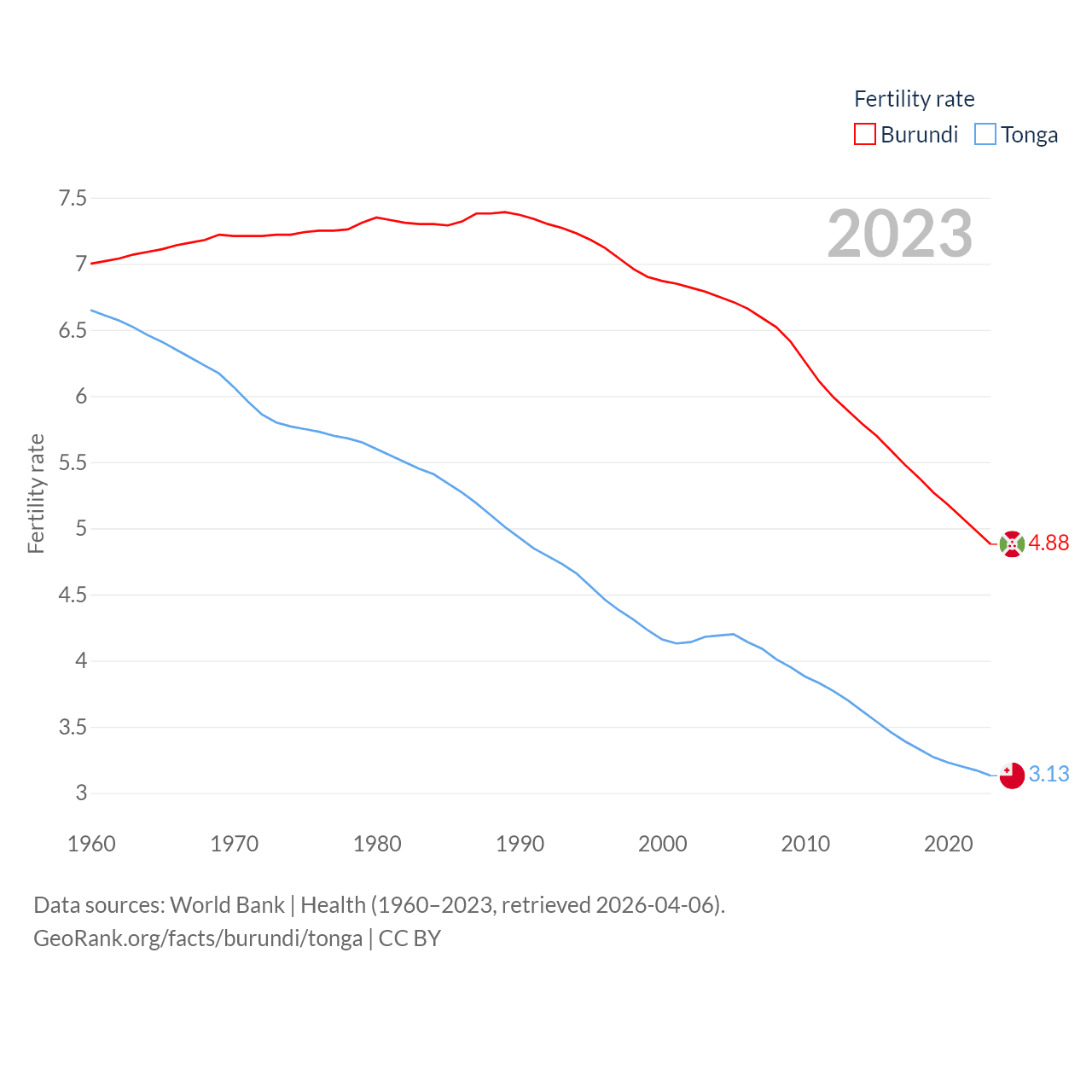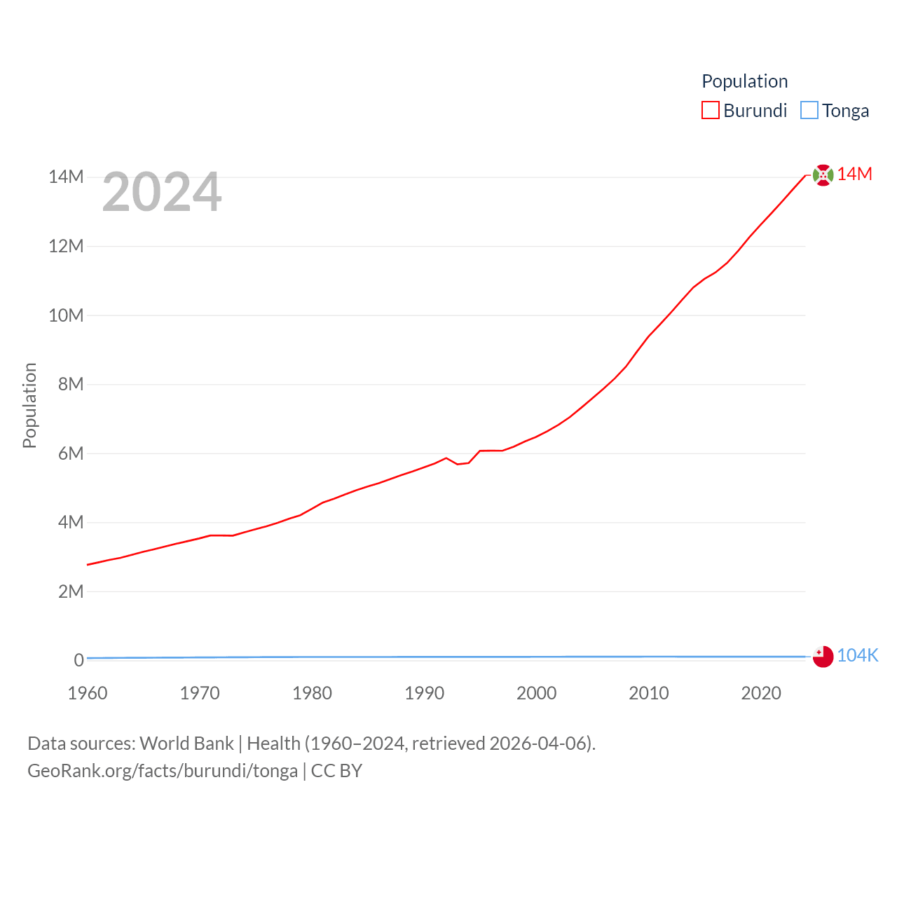 Burundi has a population of 14M (ranked 78/197), compared with 104K in Tonga (ranked 183/197). Burundi's land area is 9,915 sq mi versus 278 sq mi for Tonga (ranked 144th vs. 176th).