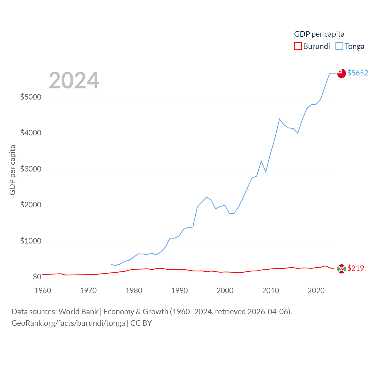 By GDP, Burundi ranks 169/197 ($3.08B) and Tonga ranks 191/197 ($591M). By GDP per capita, Burundi ranks 197/197 ($219.4), while Tonga ranks 115/197 ($5,652).