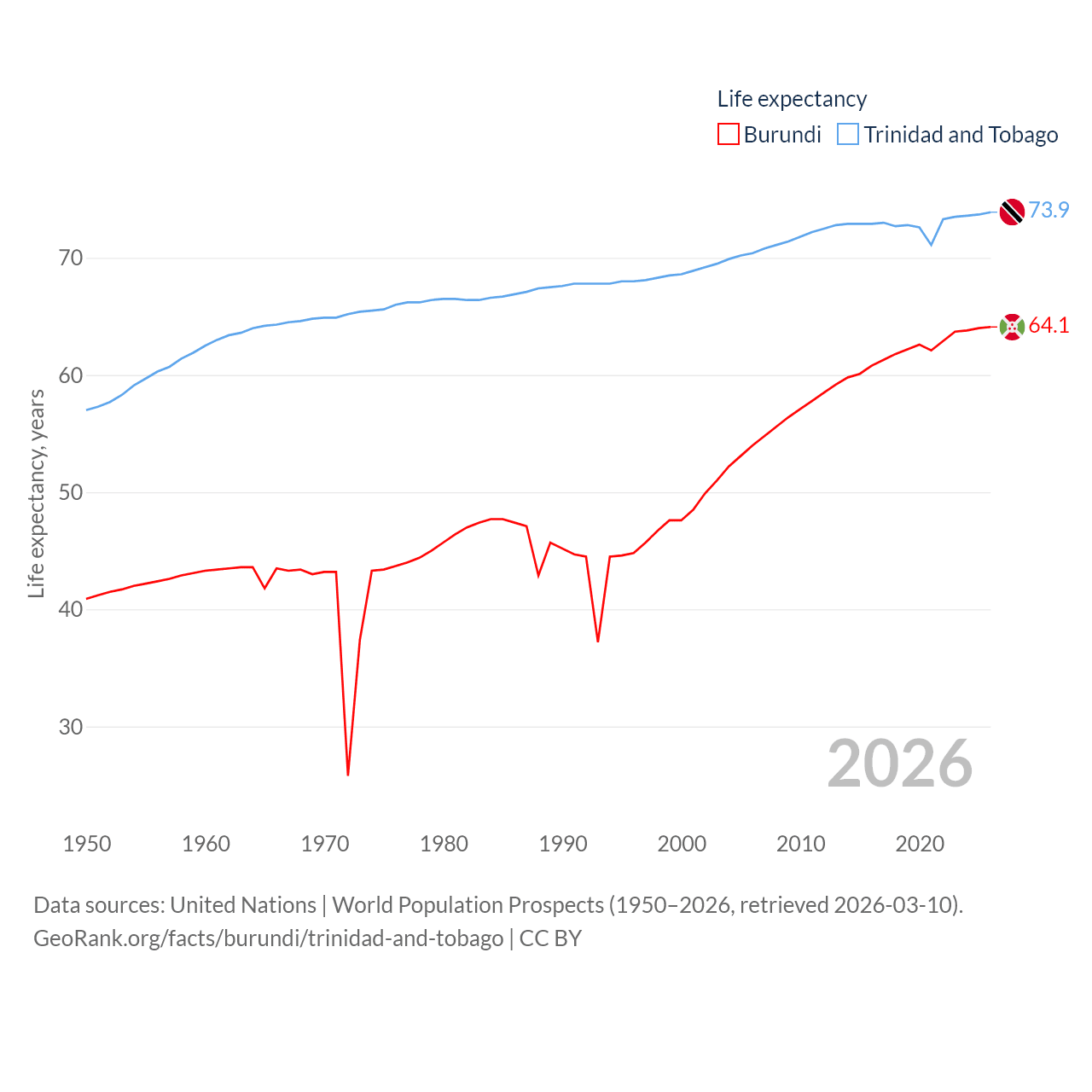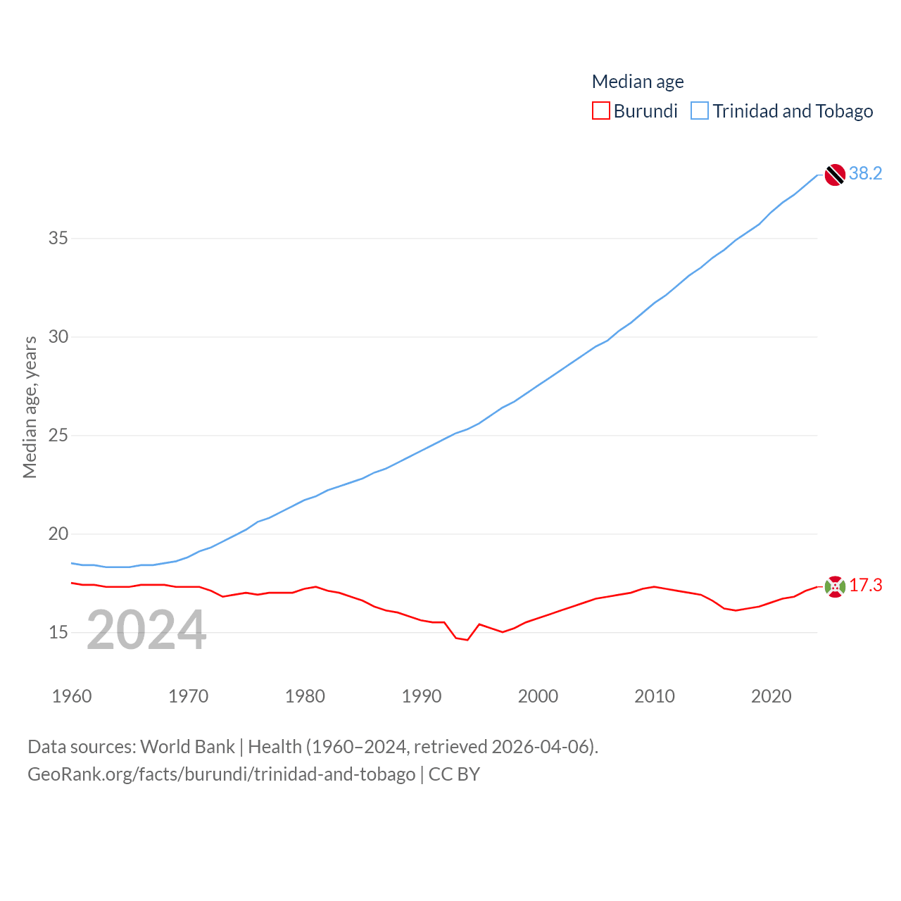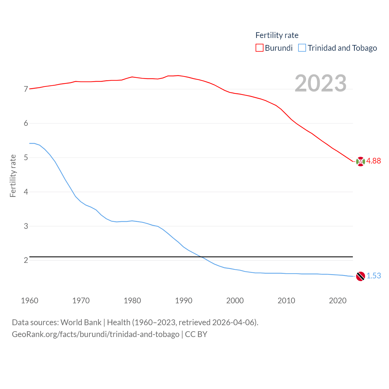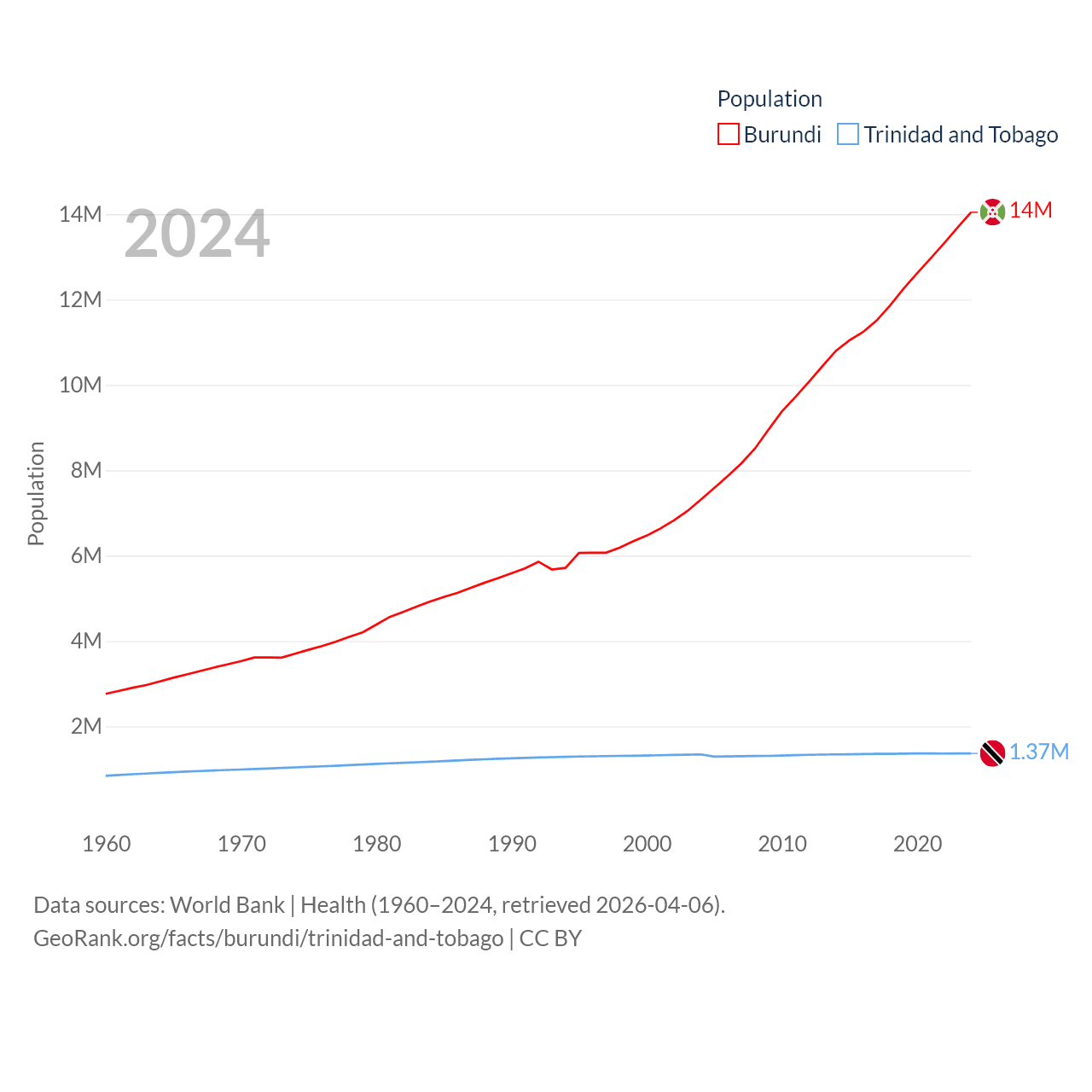 Burundi has a population of 14M (ranked 78/197), compared with 1.37M in Trinidad and Tobago (ranked 154/197). Burundi's land area is 9,915 sq mi versus 1,981 sq mi for Trinidad and Tobago (ranked 144th vs. 166th).