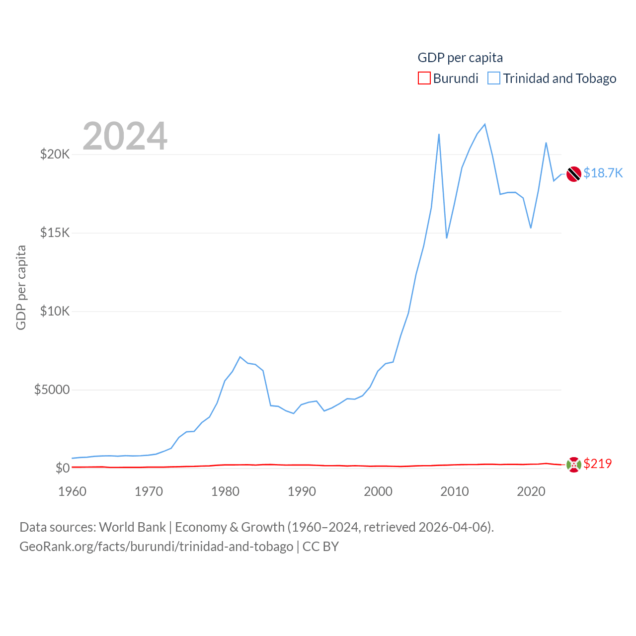 By GDP, Burundi ranks 169/197 ($3.08B) and Trinidad and Tobago ranks 115/197 ($25.6B). By GDP per capita, Burundi ranks 197/197 ($219.4), while Trinidad and Tobago ranks 61/197 ($18,733).