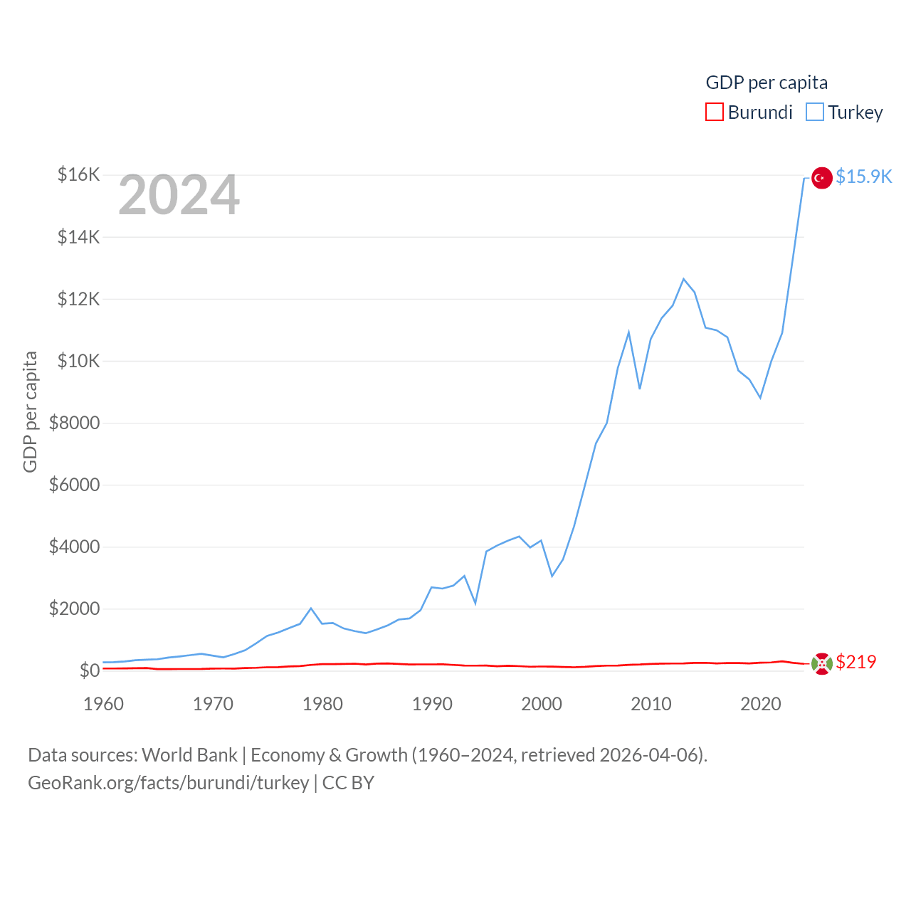 By GDP, Burundi ranks 169/197 ($3.08B) and Turkey ranks 17/197 ($1.36T). By GDP per capita, Burundi ranks 197/197 ($219.4), while Turkey ranks 66/197 ($15,893).