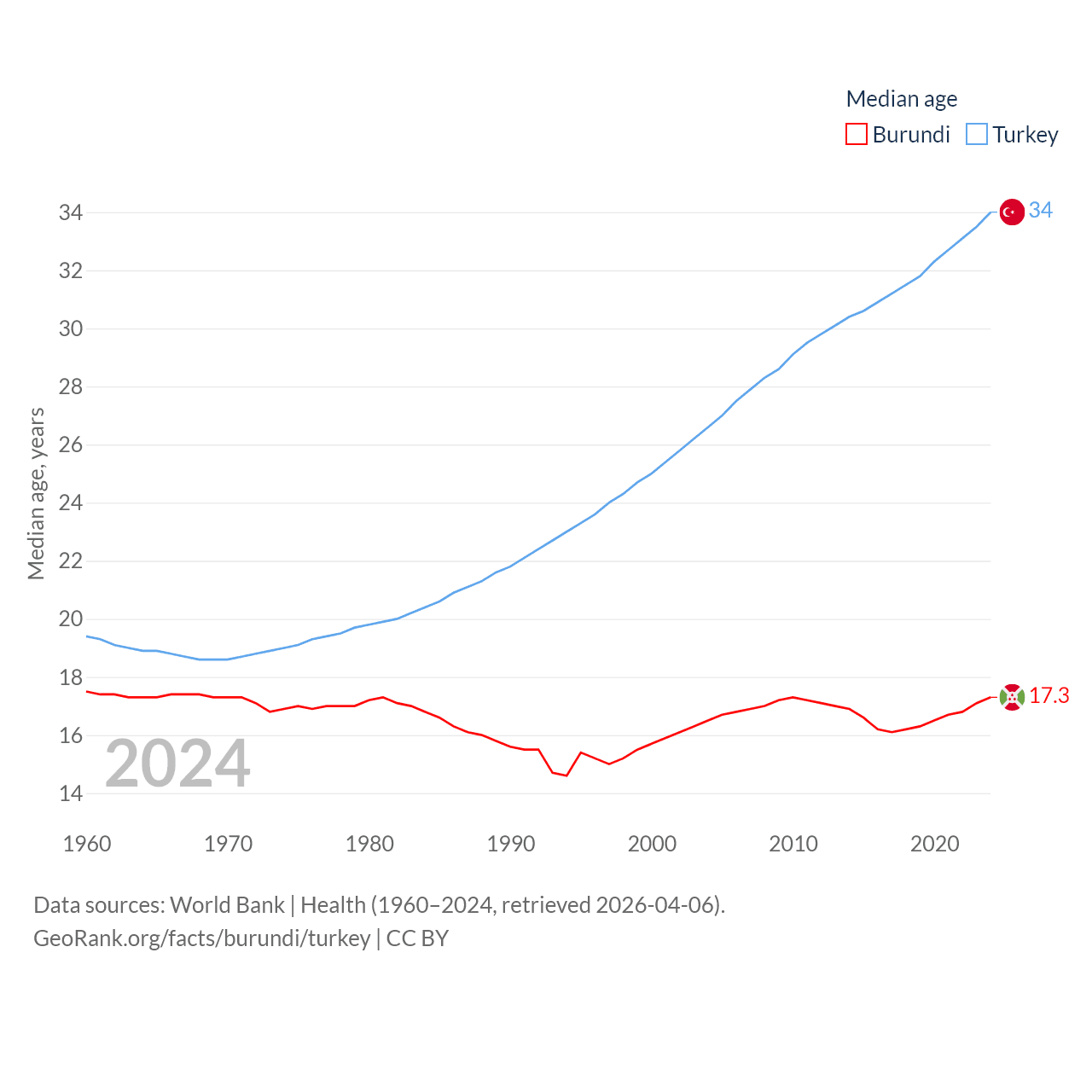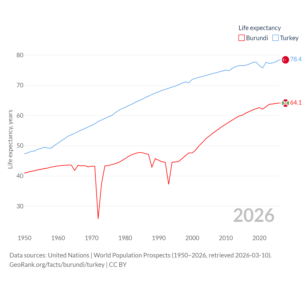 Burundi has a population of 14M (ranked 78/197), compared with 85.5M in Turkey (ranked 18/197). Burundi's land area is 9,915 sq mi versus 297,156 sq mi for Turkey (ranked 144th vs. 36th).