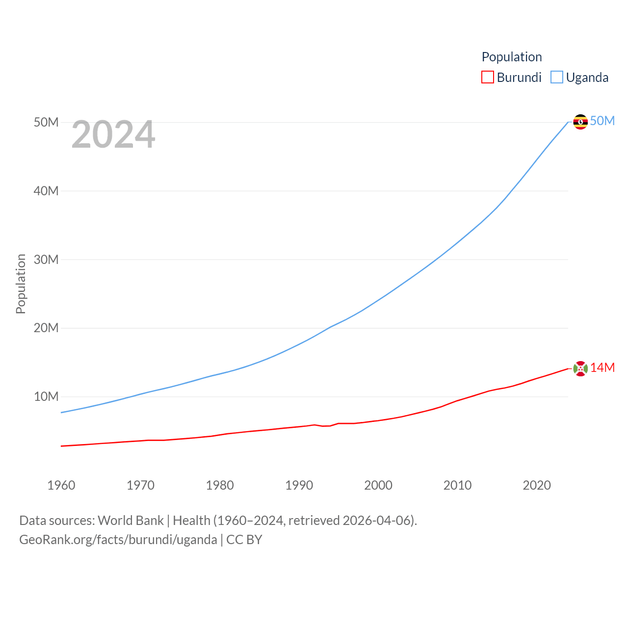 Burundi has a population of 14M (ranked 78/197), compared with 50M in Uganda (ranked 31/197). Burundi's land area is 9,915 sq mi versus 77,421 sq mi for Uganda (ranked 144th vs. 84th).