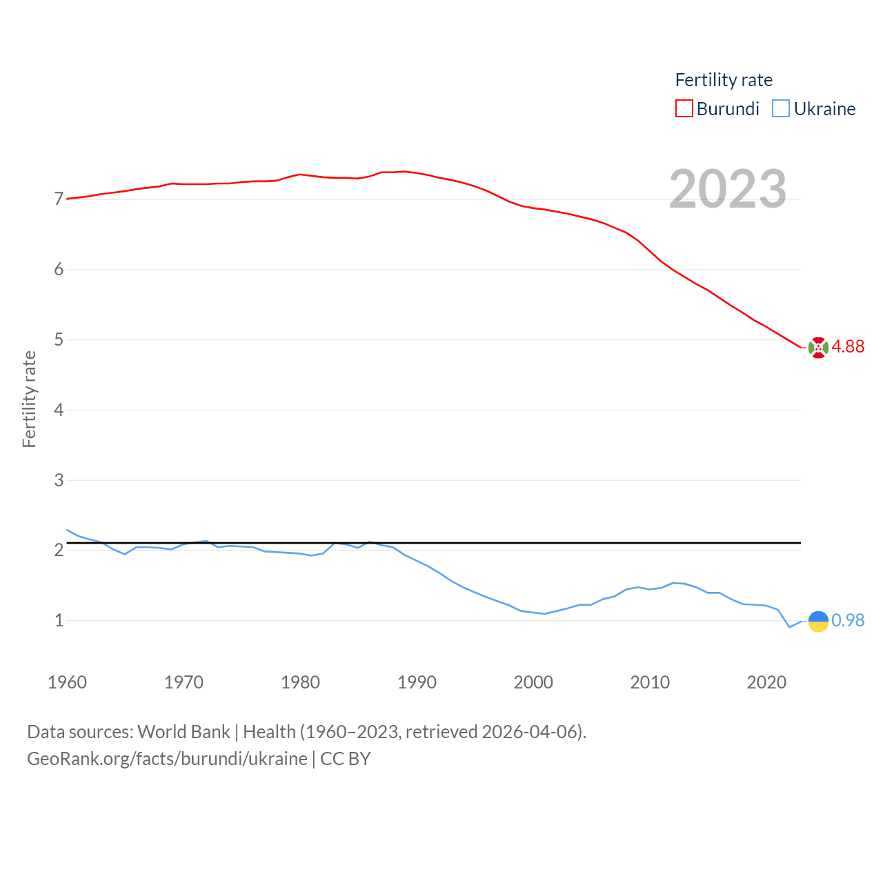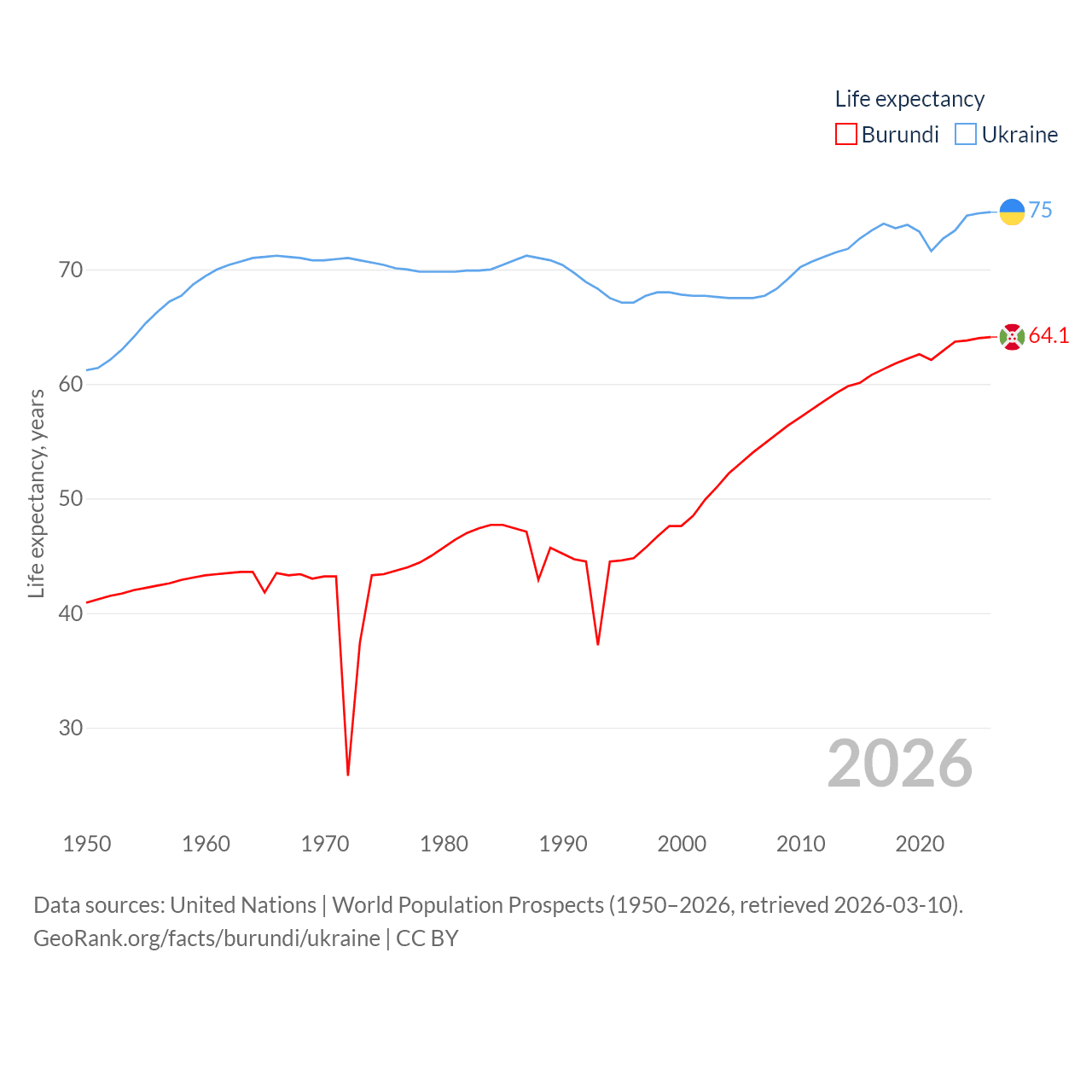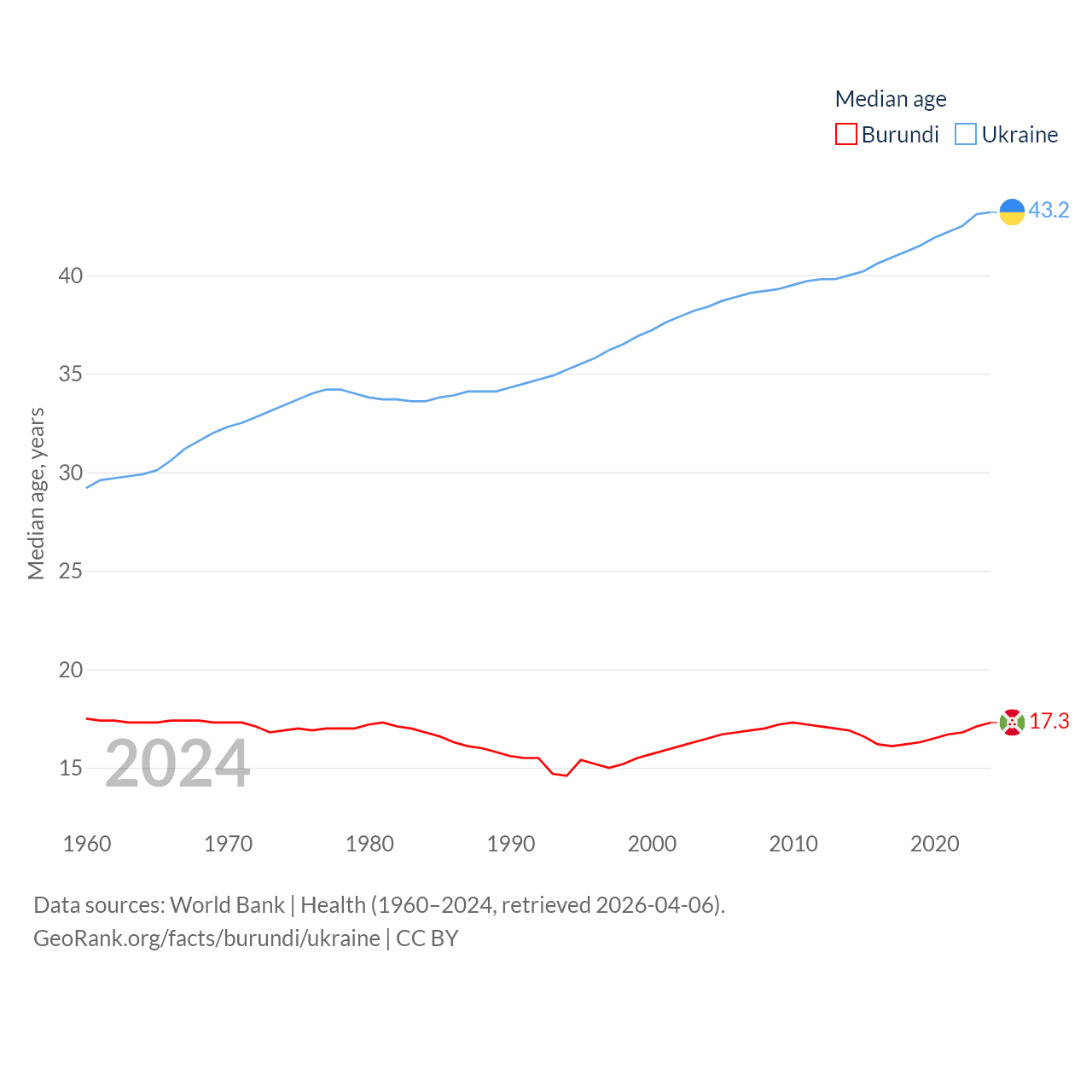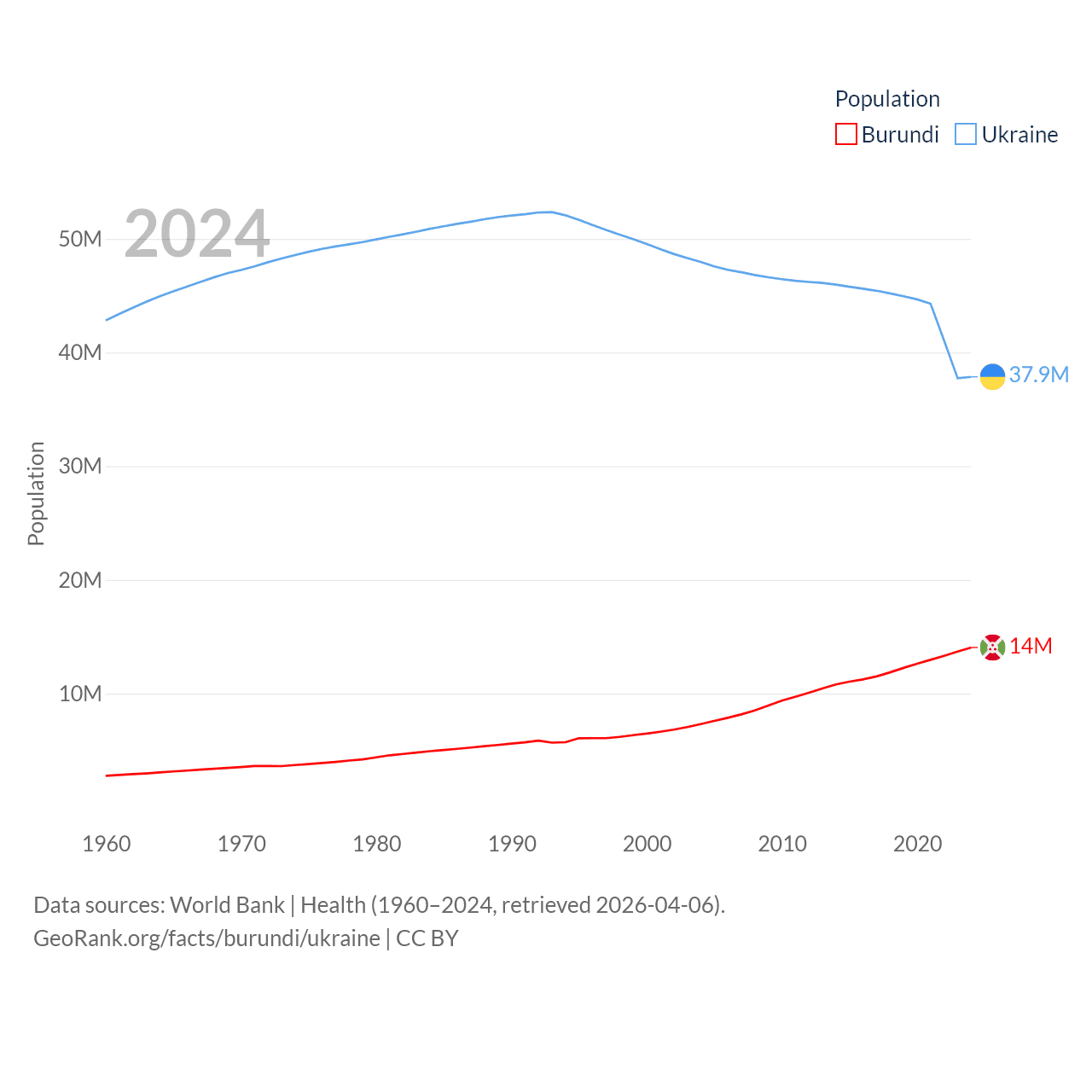 Burundi has a population of 14M (ranked 78/197), compared with 37.9M in Ukraine (ranked 41/197). Burundi's land area is 9,915 sq mi versus 223,708 sq mi for Ukraine (ranked 144th vs. 46th).