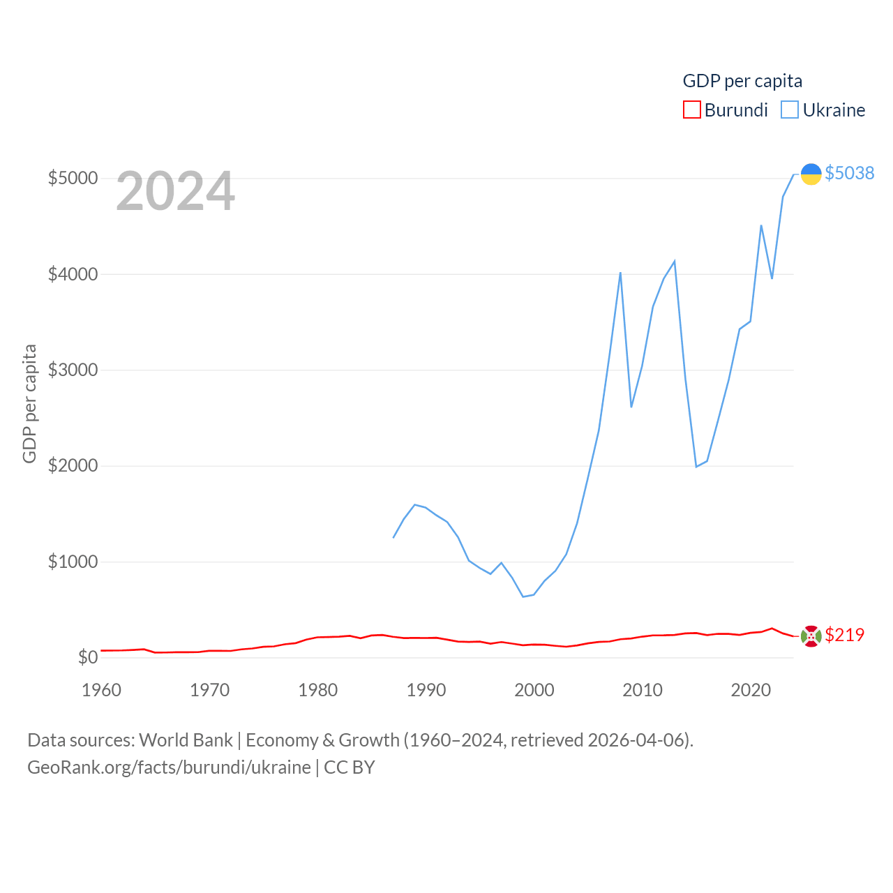 By GDP, Burundi ranks 169/197 ($3.08B) and Ukraine ranks 57/197 ($191B). By GDP per capita, Burundi ranks 197/197 ($219.4), while Ukraine ranks 120/197 ($5,038).