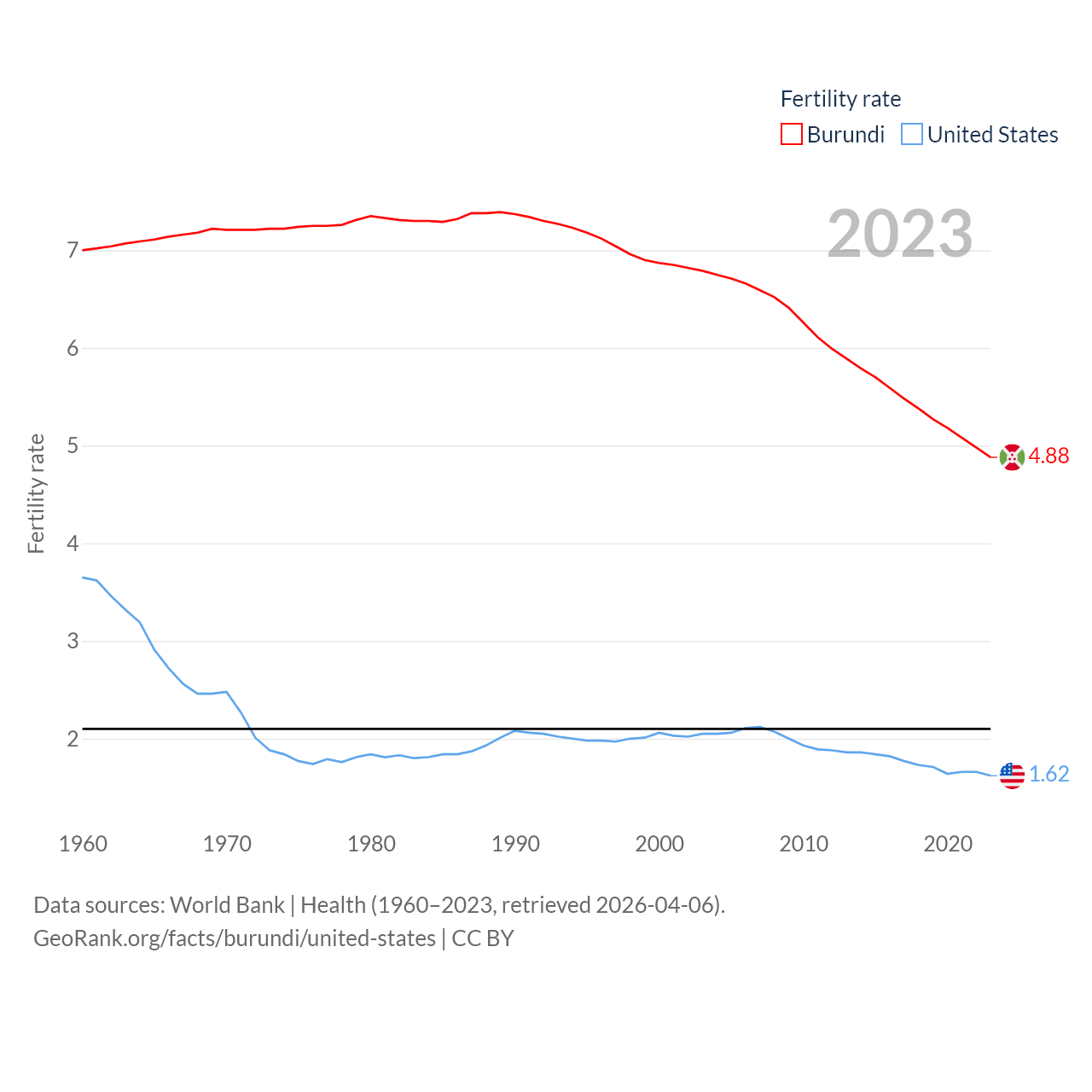 Burundi has a population of 14M (ranked 78/197), compared with 342M in The United States (ranked 3/197). Burundi's land area is 9,915 sq mi versus 3,531,839 sq mi for The United States (ranked 144th vs. 3rd).