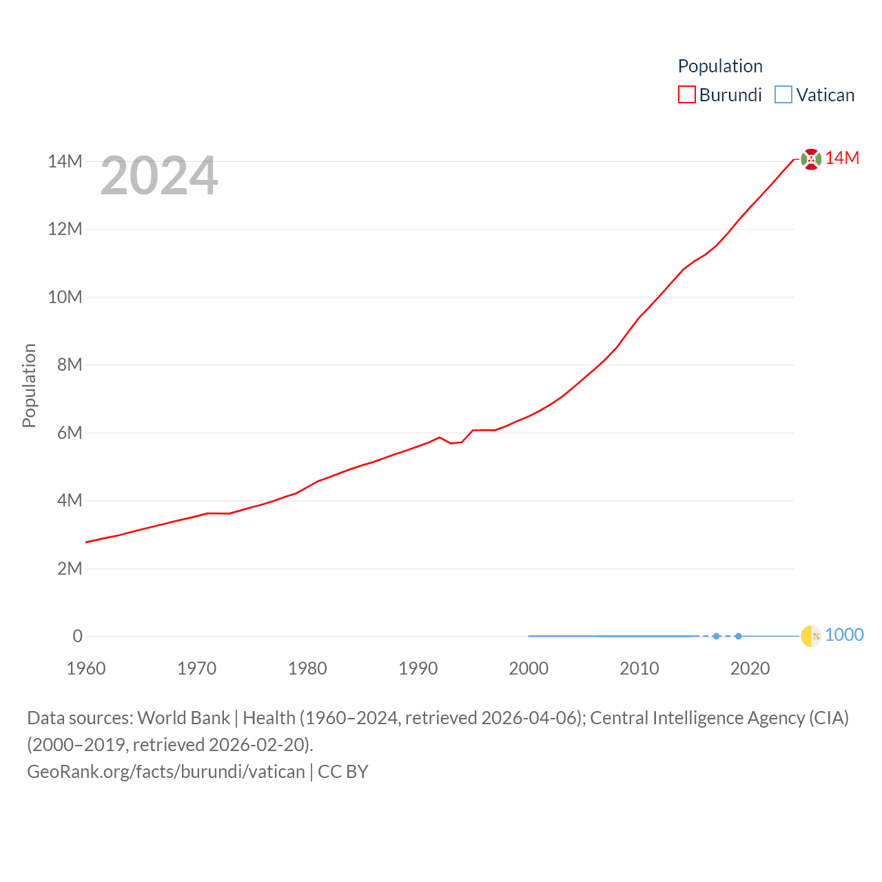 Burundi has a population of 14M (ranked 78/197), compared with 1K in The Vatican (ranked 197/197). Burundi's land area is 9,915 sq mi versus 0.17 sq mi for The Vatican (ranked 144th vs. 197th).