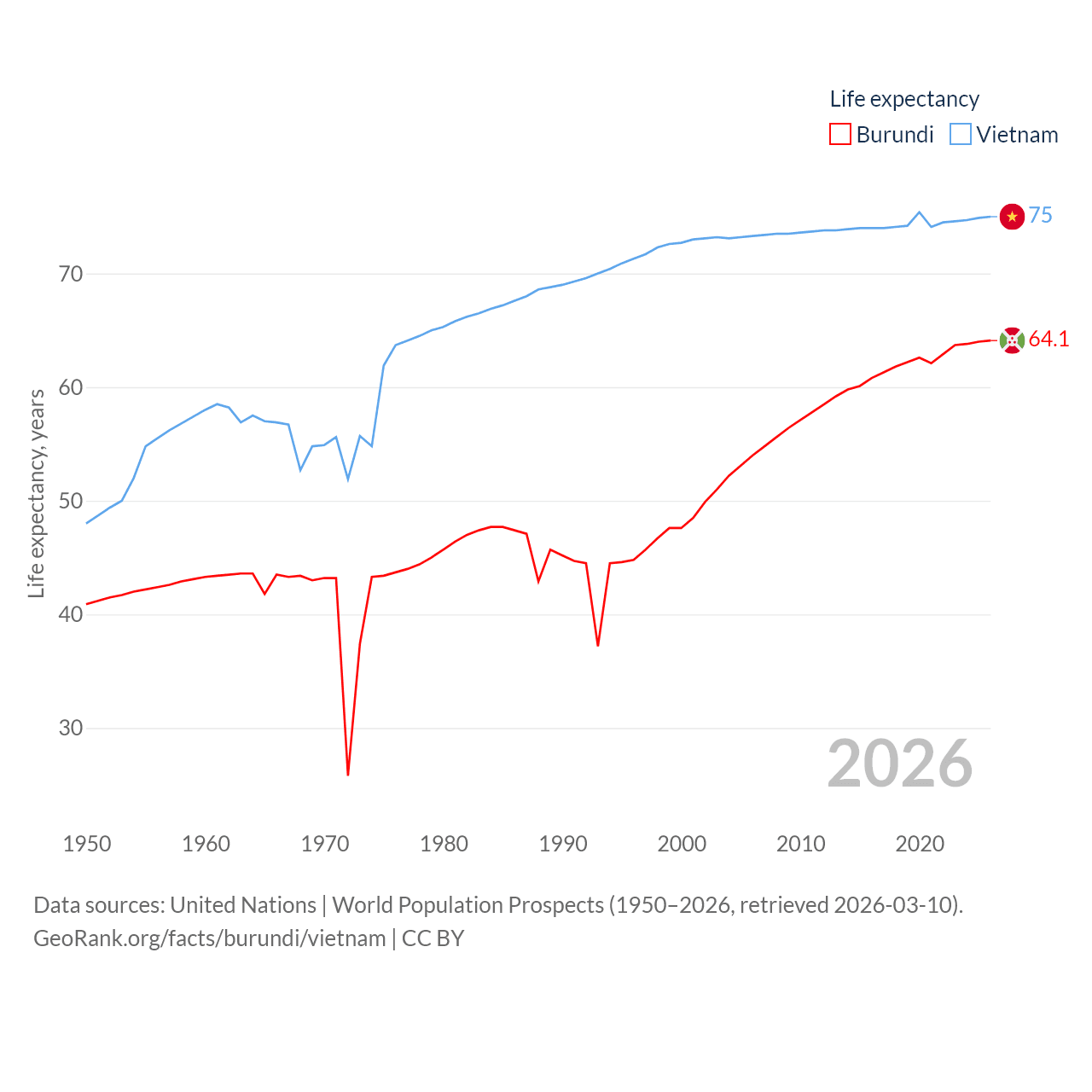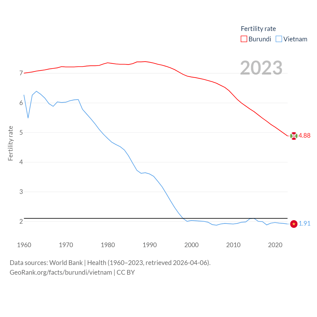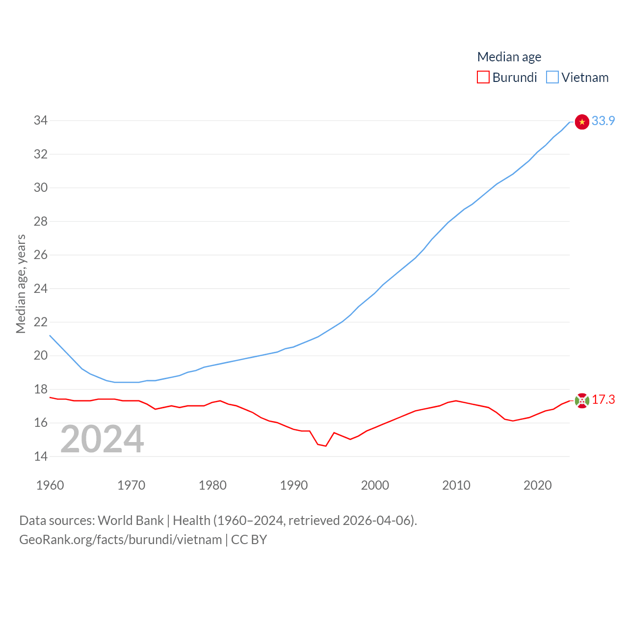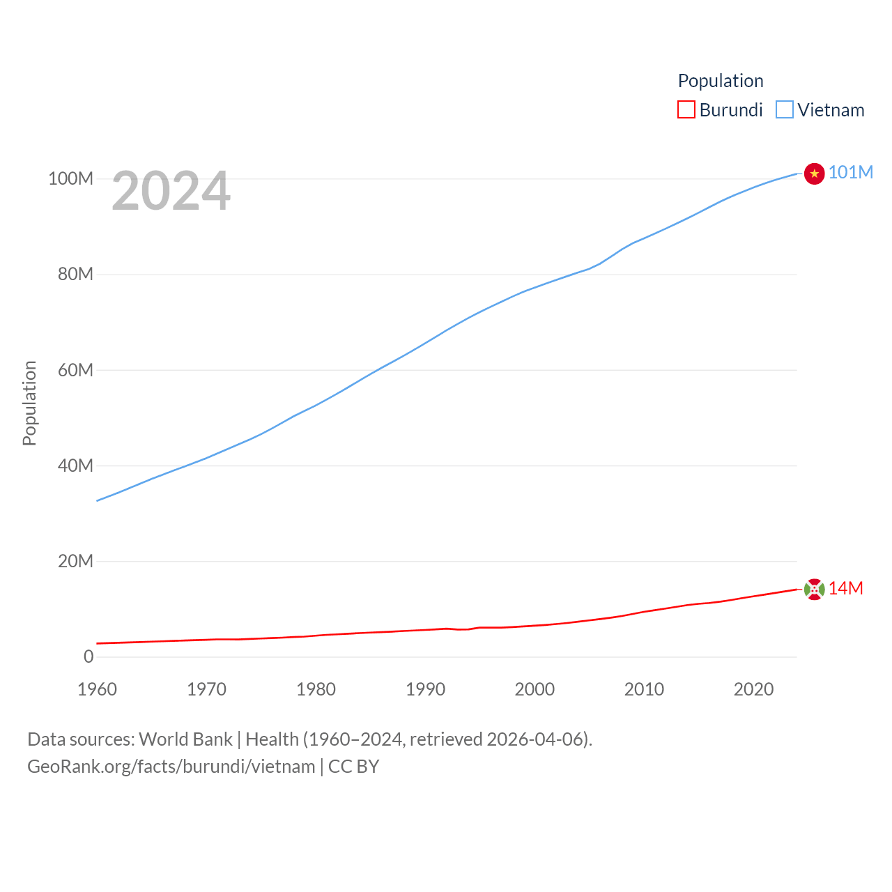 Burundi has a population of 14M (ranked 78/197), compared with 101M in Vietnam (ranked 16/197). Burundi's land area is 9,915 sq mi versus 121,016 sq mi for Vietnam (ranked 144th vs. 67th).