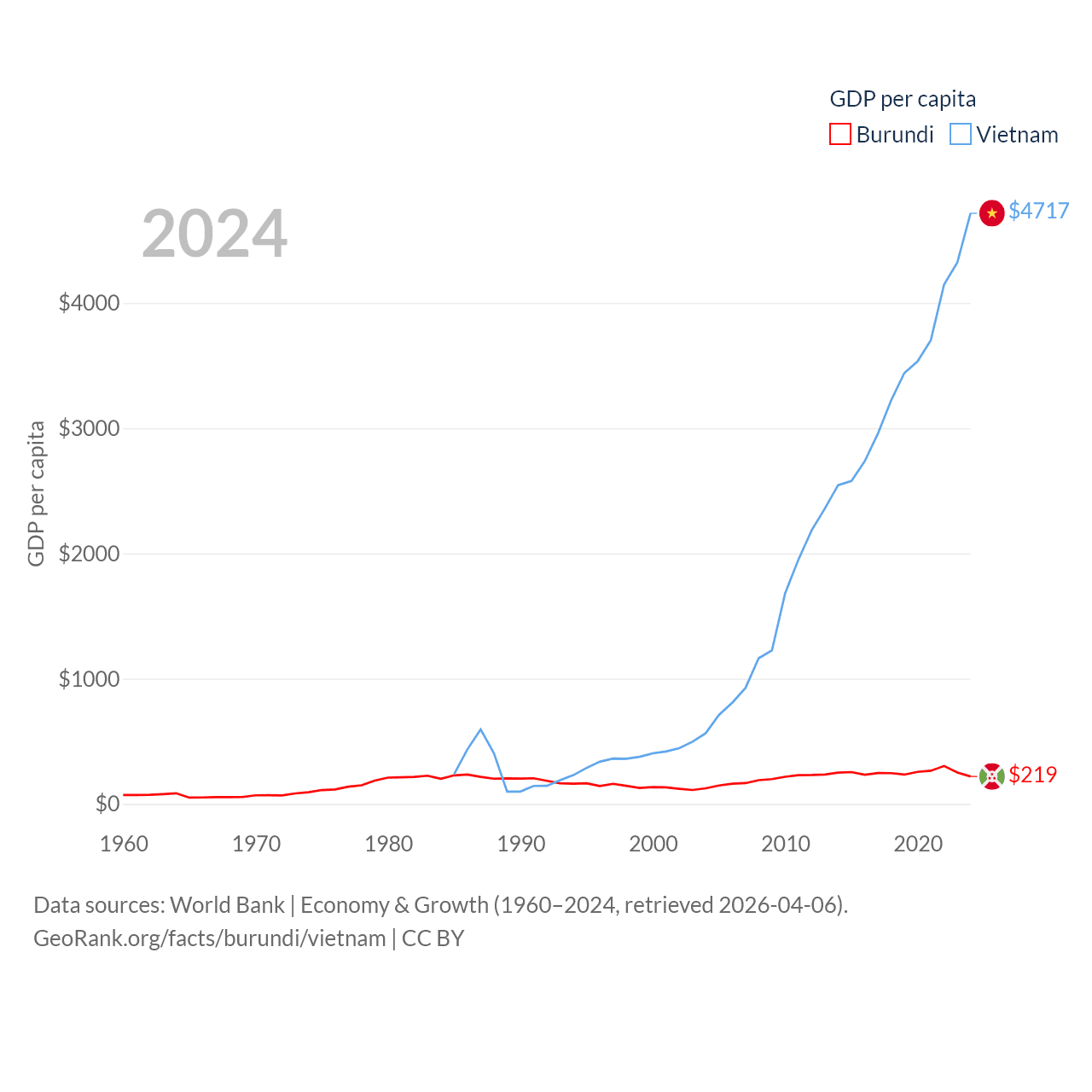 By GDP, Burundi ranks 169/197 ($3.08B) and Vietnam ranks 33/197 ($476B). By GDP per capita, Burundi ranks 197/197 ($219.4), while Vietnam ranks 122/197 ($4,717).