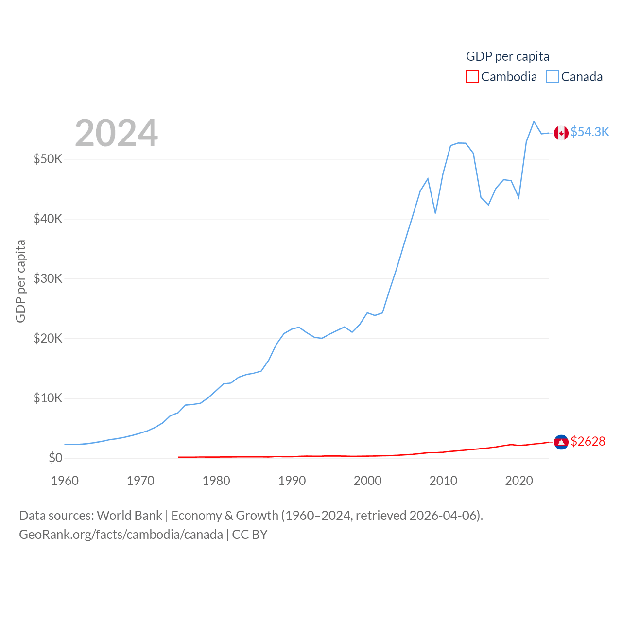 By GDP, Cambodia ranks 97/197 ($46.4B) and Canada ranks 9/197 ($2.24T). By GDP per capita, Cambodia ranks 145/197 ($2,628), while Canada ranks 20/197 ($54,340).